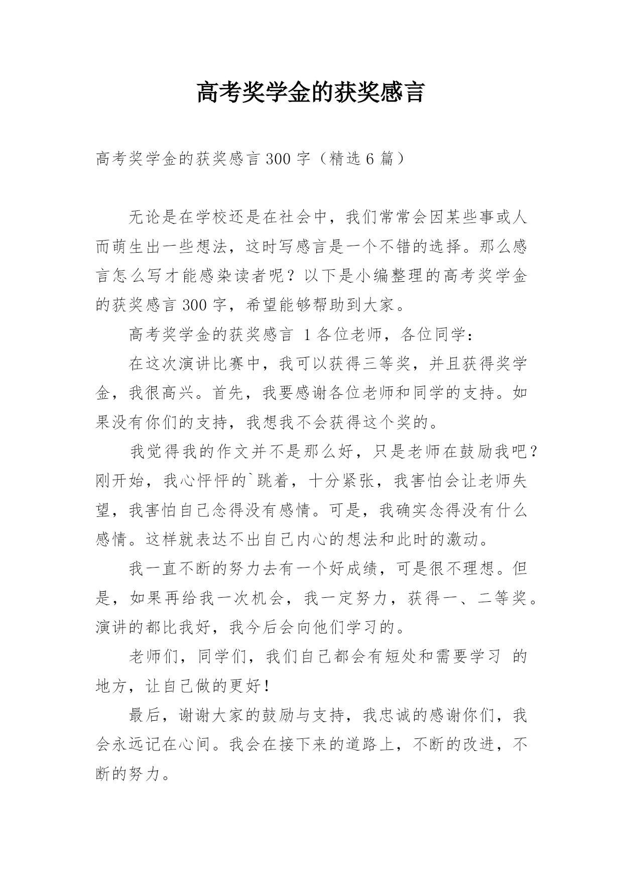 高考奖学金的获奖感言高考奖学金的获奖感言300字(精选6篇)无论是在学校还是在社会中,我们常常会因某些事或人而萌生出一些想法,这时写感言是一个不错的选择。那么感言怎么写才能感染读者呢?以下是小编整理的高考奖学金的获奖感言300字,希望能够帮助到大家。高考奖学金的获奖感言1各位老师,各位同学:在这次演讲比赛中,我可以获得三等奖,并且获得奖学金,我很高兴。首先,我要感谢各位老师和同学的支持。如果没有你们的支持,我想我不会获得这个奖的。我觉得我的作文并不是那么好,只是老师在鼓励我吧?刚开始,我心怦怦的`跳着,十