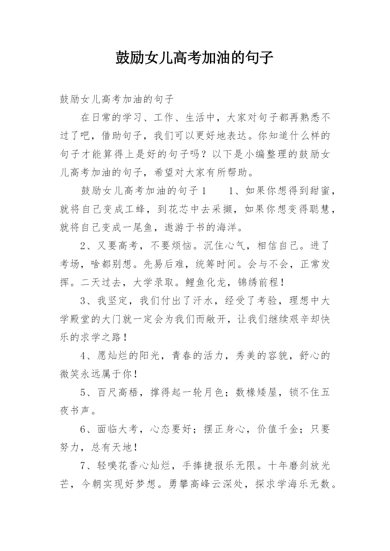 鼓励女儿高考加油的句子鼓励女儿高考加油的句子在日常的学习、工作、生活中,大家对句子都再熟悉不过了吧,借助句子,我们可以更好地表达。你知道什么样的句子才能算得上是好的句子吗?以下是小编整理的鼓励女儿高考加油的句子,希望对大家有所帮助。鼓励女儿高考加油的句子11、如果你想得到甜蜜,就将自己变成工蜂,到花芯中去采撷,如果你想变得聪慧,就将自己变成一尾鱼,遨游于书的海洋。2、又要高考,不要烦恼。沉住心气,相信自己。进了考场,啥都别想。先易后难,统筹时间。会与不会,正常发挥。二天过去,大学录取。鲤鱼化龙,锦绣前程!