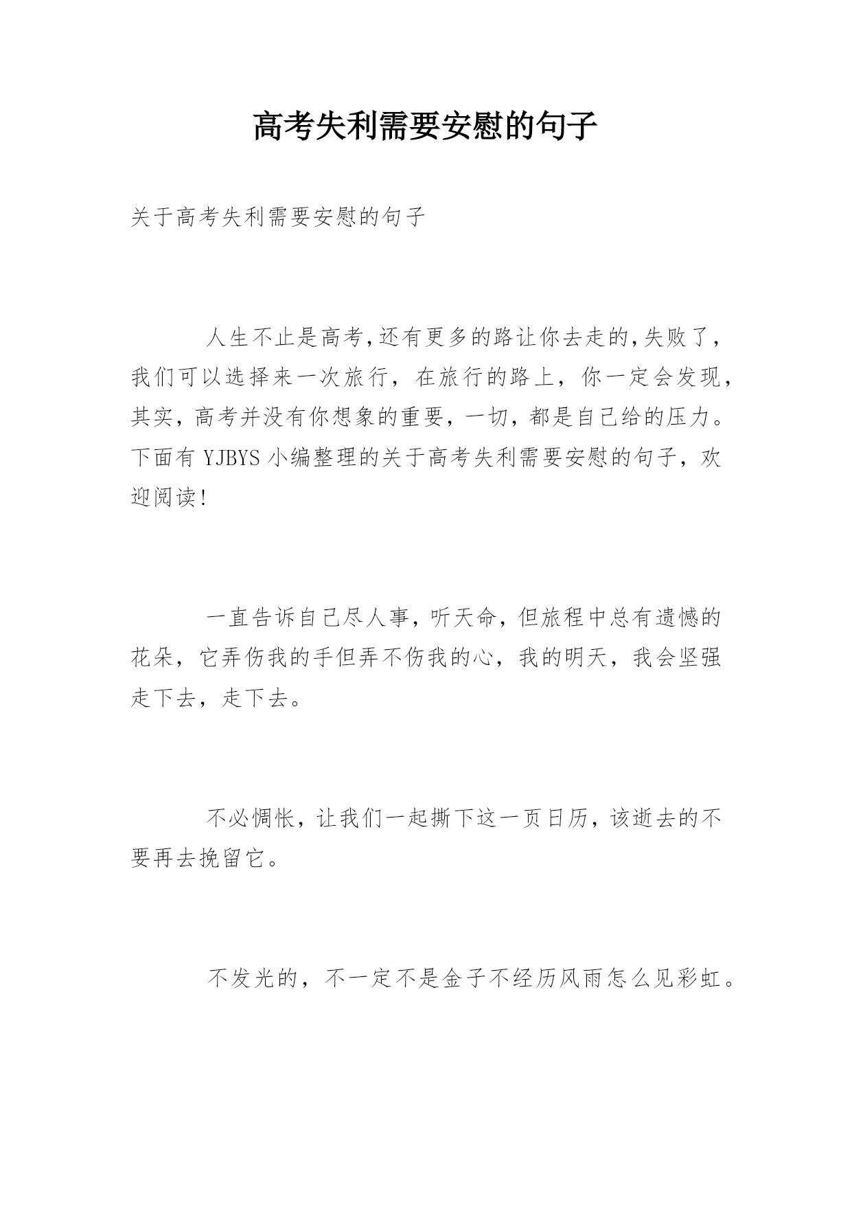 高考失利需要安慰的句子关于高考失利需要安慰的句子人生不止是高考,还有更多的路让你去走的,失败了,我们可以选择来一次旅行,在旅行的路上,你一定会发现,其实,高考并没有你想象的重要,一切,都是自己给的压力。下面有YJBYS小编整理的关于高考失利需要安慰的句子,欢迎阅读!一直告诉自己尽人事,听天命,但旅程中总有遗憾的花朵,它弄伤我的手但弄不伤我的心,我的明天,我会坚强走下去,走下去。不必惆怅,让我们一起撕下这一页日历,该逝去的不要再去挽留它。不发光的,不一定不是金子不经历风雨怎么见彩虹。假如考题欺骗了你,不要悲