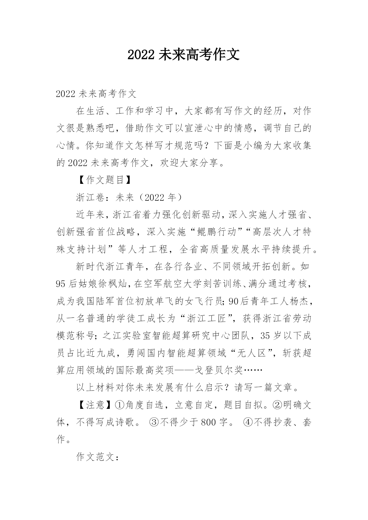 2022未来高考作文2022未来高考作文在生活、工作和学习中,大家都有写作文的经历,对作文很是熟悉吧,借助作文可以宣泄心中的情感,调节自己的心情。你知道作文怎样写才规范吗?下面是小编为大家收集的2022未来高考作文,欢迎大家分享。【作文题目】浙江卷:未来(2022年)近年来,浙江省着力强化创新驱动,深入实施人才强省、创新强省首位战略,深入实施“鲲鹏行动”“高层次人才特殊支持计划”等人才工程,全省高质量发展水平持续提升。新时代浙江青年,在各行各业、不同领域开拓创新。如95后姑娘徐枫灿,在空军航空大学刻苦训练