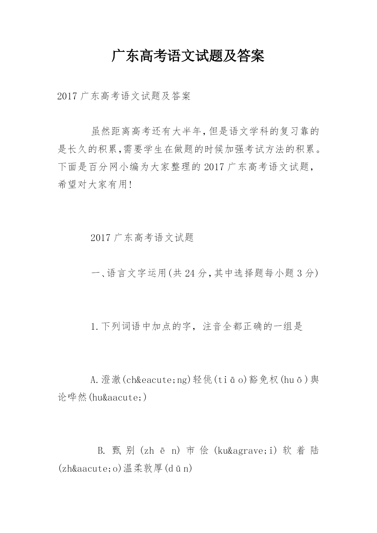 广东高考语文试题及答案2017广东高考语文试题及答案虽然距离高考还有大半年,但是语文学科的复习靠的是长久的积累,需要学生在做题的时候加强考试方法的积累。下面是百分网小编为大家整理的2017广东高考语文试题,希望对大家有用!2017广东高考语文试题一、语言文字运用(共24分,其中选择题每小题3分)1.下列词语中加点的字,注音全都正确的一组是A.澄澈(chéng)轻佻(tiāo)豁免权(huō)舆论哗然(huá)B.甄别(zhēn)市侩(kuài)软着陆(zh&aac