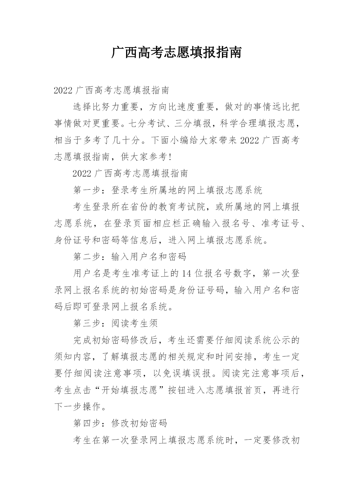 广西高考志愿填报指南2022广西高考志愿填报指南选择比努力重要,方向比速度重要,做对的事情远比把事情做对更重要。七分考试、三分填报,科学合理填报志愿,相当于多考了几十分。下面小编给大家带来2022广西高考志愿填报指南,供大家参考!2022广西高考志愿填报指南第一步:登录考生所属地的网上填报志愿系统考生登录所在省份的教育考试院,或所属地的网上填报志愿系统,在登录页面相应栏正确输入报名号、准考证号、身份证号和密码等信息后,进入网上填报志愿系统。第二步:输入用户名和密码用户名是考生准考证上的14位报名号数字,第