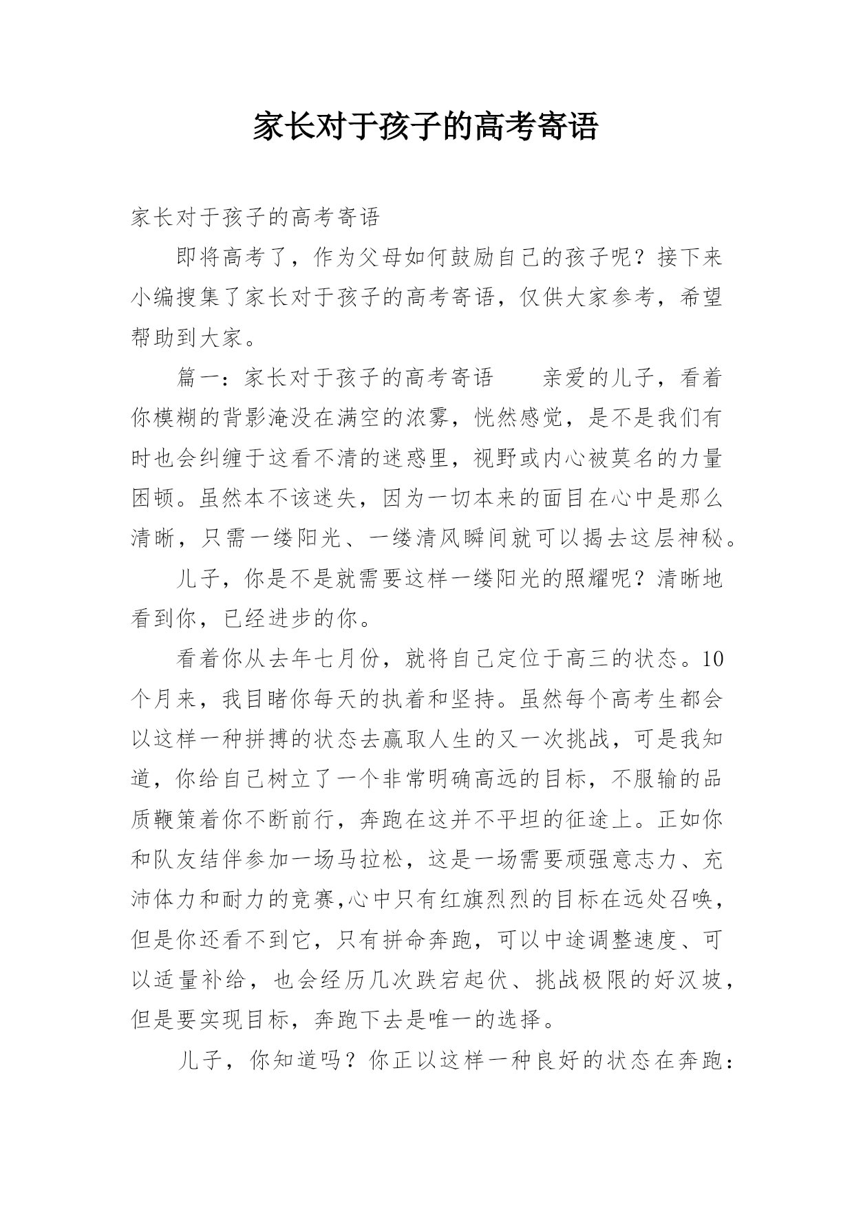家长对于孩子的高考寄语家长对于孩子的高考寄语即将高考了,作为父母如何鼓励自己的孩子呢?接下来小编搜集了家长对于孩子的高考寄语,仅供大家参考,希望帮助到大家。篇一:家长对于孩子的高考寄语亲爱的儿子,看着你模糊的背影淹没在满空的浓雾,恍然感觉,是不是我们有时也会纠缠于这看不清的迷惑里,视野或内心被莫名的力量困顿。虽然本不该迷失,因为一切本来的面目在心中是那么清晰,只需一缕阳光、一缕清风瞬间就可以揭去这层神秘。儿子,你是不是就需要这样一缕阳光的照耀呢?清晰地看到你,已经进步的你。看着你从去年七月份,就将自己定位