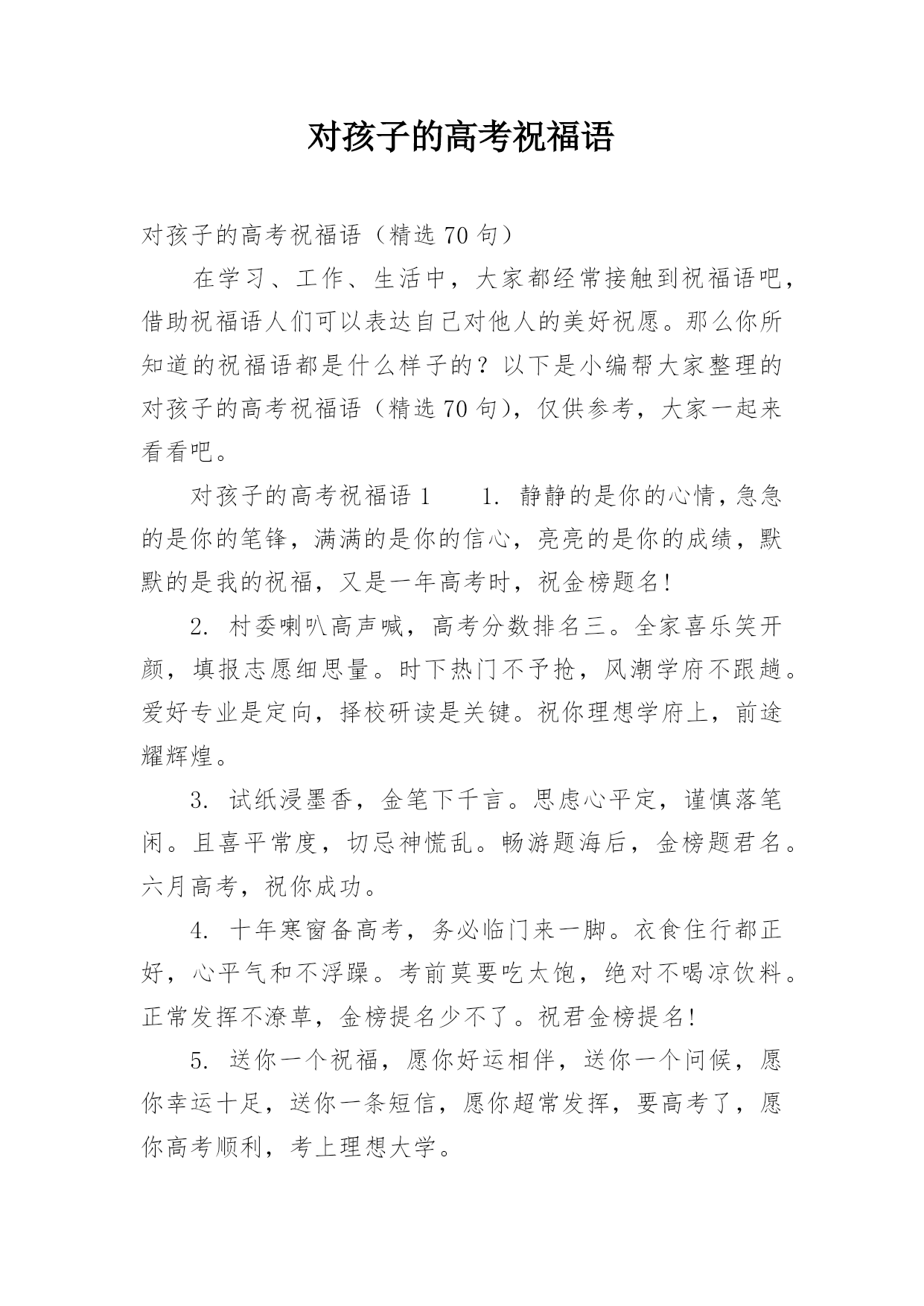 对孩子的高考祝福语对孩子的高考祝福语(精选70句)在学习、工作、生活中,大家都经常接触到祝福语吧,借助祝福语人们可以表达自己对他人的美好祝愿。那么你所知道的祝福语都是什么样子的?以下是小编帮大家整理的对孩子的高考祝福语(精选70句),仅供参考,大家一起来看看吧。对孩子的高考祝福语11.静静的是你的心情,急急的是你的笔锋,满满的是你的信心,亮亮的是你的成绩,默默的是我的祝福,又是一年高考时,祝金榜题名!2.村委喇叭高声喊,高考分数排名三。全家喜乐笑开颜,填报志愿细思量。时下热门不予抢,风潮学府不跟趟。爱好专