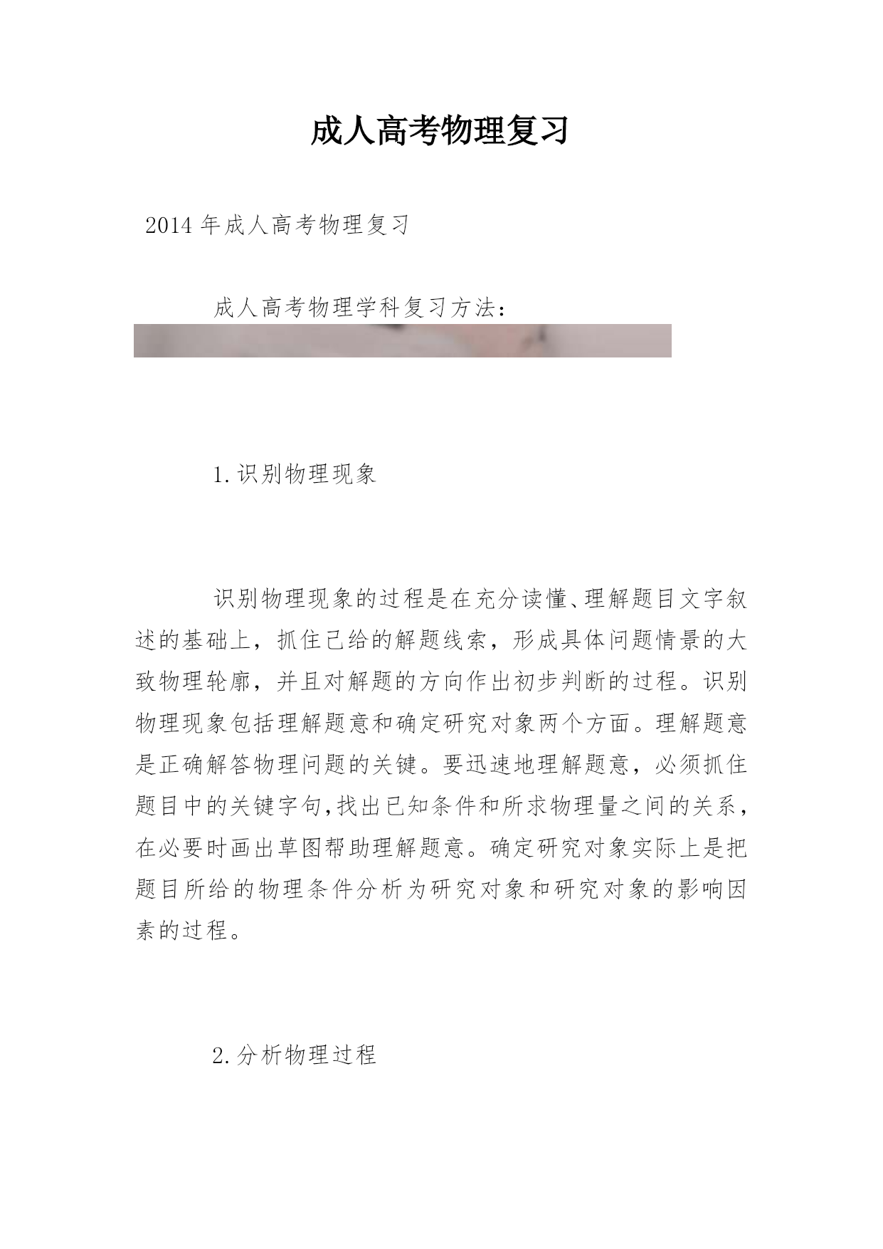 成人高考物理复习2014年成人高考物理复习成人高考物理学科复习方法:1.识别物理现象识别物理现象的过程是在充分读懂、理解题目文字叙述的基础上,抓住己给的解题线索,形成具体问题情景的大致物理轮廓,并且对解题的方向作出初步判断的过程。识别物理现象包括理解题意和确定研究对象两个方面。理解题意是正确解答物理问题的关键。要迅速地理解题意,必须抓住题目中的关键字句,找出已知条件和所求物理量之间的关系,在必要时画出草图帮助理解题意。确定研究对象实际上是把题目所给的物理条件分析为研究对象和研究对象的影响因素的过程。2.分