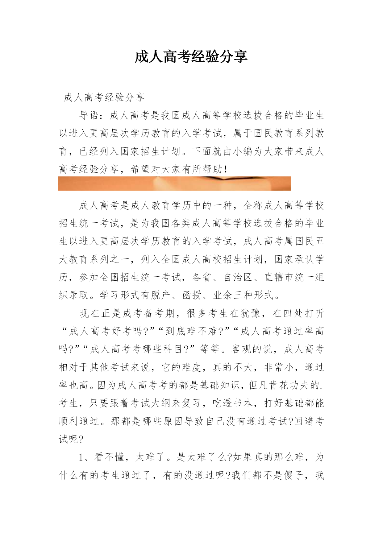 成人高考经验分享成人高考经验分享导语:成人高考是我国成人高等学校选拔合格的毕业生以进入更高层次学历教育的入学考试,属于国民教育系列教育,已经列入国家招生计划。下面就由小编为大家带来成人高考经验分享,希望对大家有所帮助!成人高考是成人教育学历中的一种,全称成人高等学校招生统一考试,是为我国各类成人高等学校选拔合格的毕业生以进入更高层次学历教育的入学考试,成人高考属国民五大教育系列之一,列入全国成人高校招生计划,国家承认学历,参加全国招生统一考试,各省、自治区、直辖市统一组织录取。学习形式有脱产、函授、业余三