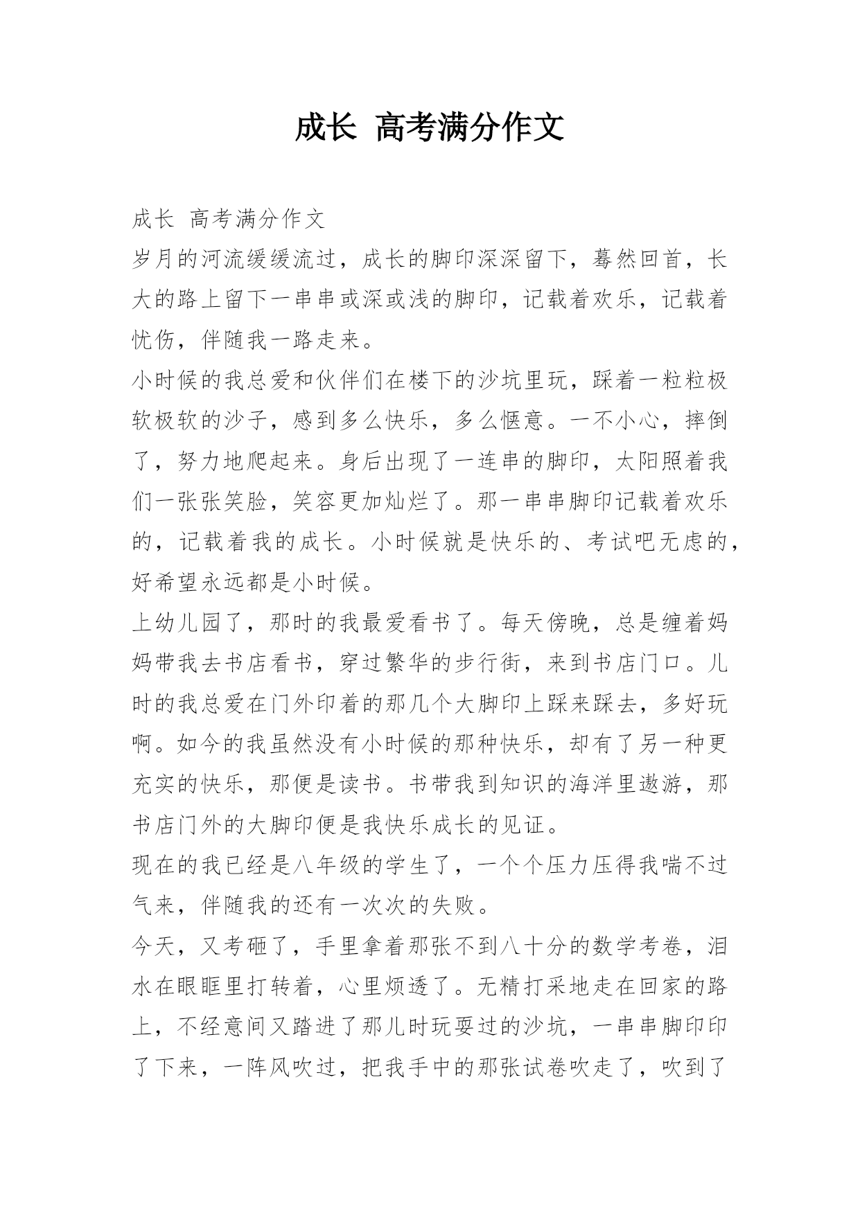 成长高考满分作文成长高考满分作文岁月的河流缓缓流过,成长的脚印深深留下,蓦然回首,长大的路上留下一串串或深或浅的脚印,记载着欢乐,记载着忧伤,伴随我一路走来。小时候的我总爱和伙伴们在楼下的沙坑里玩,踩着一粒粒极软极软的沙子,感到多么快乐,多么惬意。一不小心,摔倒了,努力地爬起来。身后出现了一连串的脚印,太阳照着我们一张张笑脸,笑容更加灿烂了。那一串串脚印记载着欢乐的,记载着我的成长。小时候就是快乐的、考试吧无虑的,好希望永远都是小时候。上幼儿园了,那时的我最爱看书了。每天傍晚,总是缠着妈妈带我去书店看书,