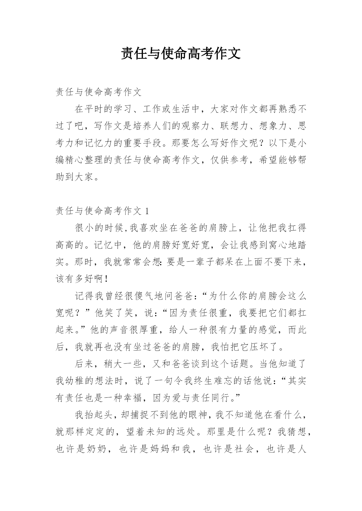 责任与使命高考作文责任与使命高考作文在平时的学习、工作或生活中,大家对作文都再熟悉不过了吧,写作文是培养人们的观察力、联想力、想象力、思考力和记忆力的重要手段。那要怎么写好作文呢?以下是小编精心整理的责任与使命高考作文,仅供参考,希望能够帮助到大家。责任与使命高考作文1很小的时候,我喜欢坐在爸爸的肩膀上,让他把我扛得高高的。记忆中,他的肩膀好宽好宽,会让我感到窝心地踏实。那时,我就常常会想:要是一辈子都呆在上面不要下来,该有多好啊!记得我曾经很傻气地问爸爸:“为什么你的肩膀会这么宽呢?”他笑了笑,说:“因