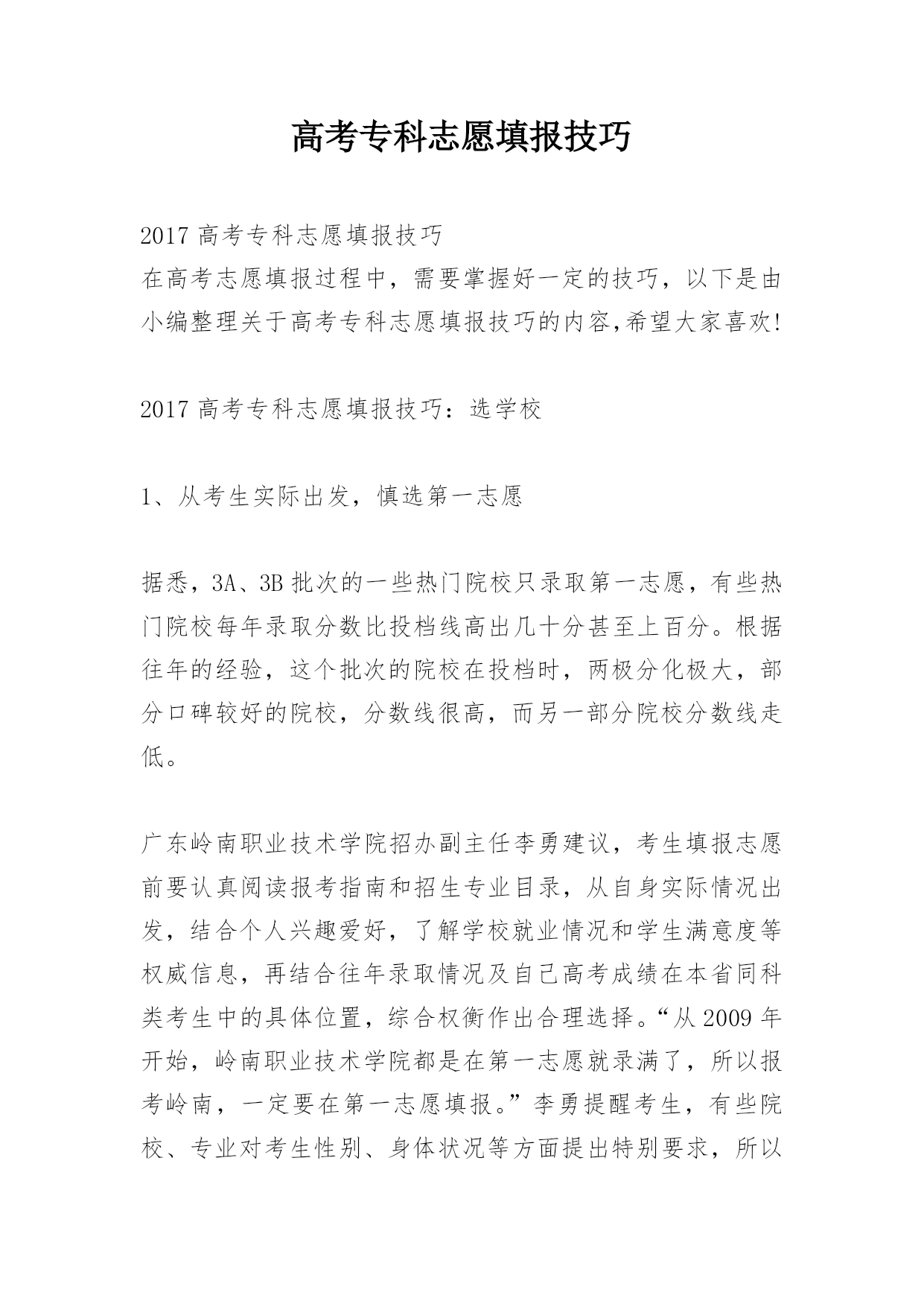 高考专科志愿填报技巧2017高考专科志愿填报技巧在高考志愿填报过程中,需要掌握好一定的技巧,以下是由小编整理关于高考专科志愿填报技巧的内容,希望大家喜欢!2017高考专科志愿填报技巧:选学校1、从考生实际出发,慎选第一志愿据悉,3A、3B批次的一些热门院校只录取第一志愿,有些热门院校每年录取分数比投档线高出几十分甚至上百分。根据往年的经验,这个批次的院校在投档时,两极分化极大,部分口碑较好的院校,分数线很高,而另一部分院校分数线走低。广东岭南职业技术学院招办副主任李勇建议,考生填报志愿前要认真阅读报考指南