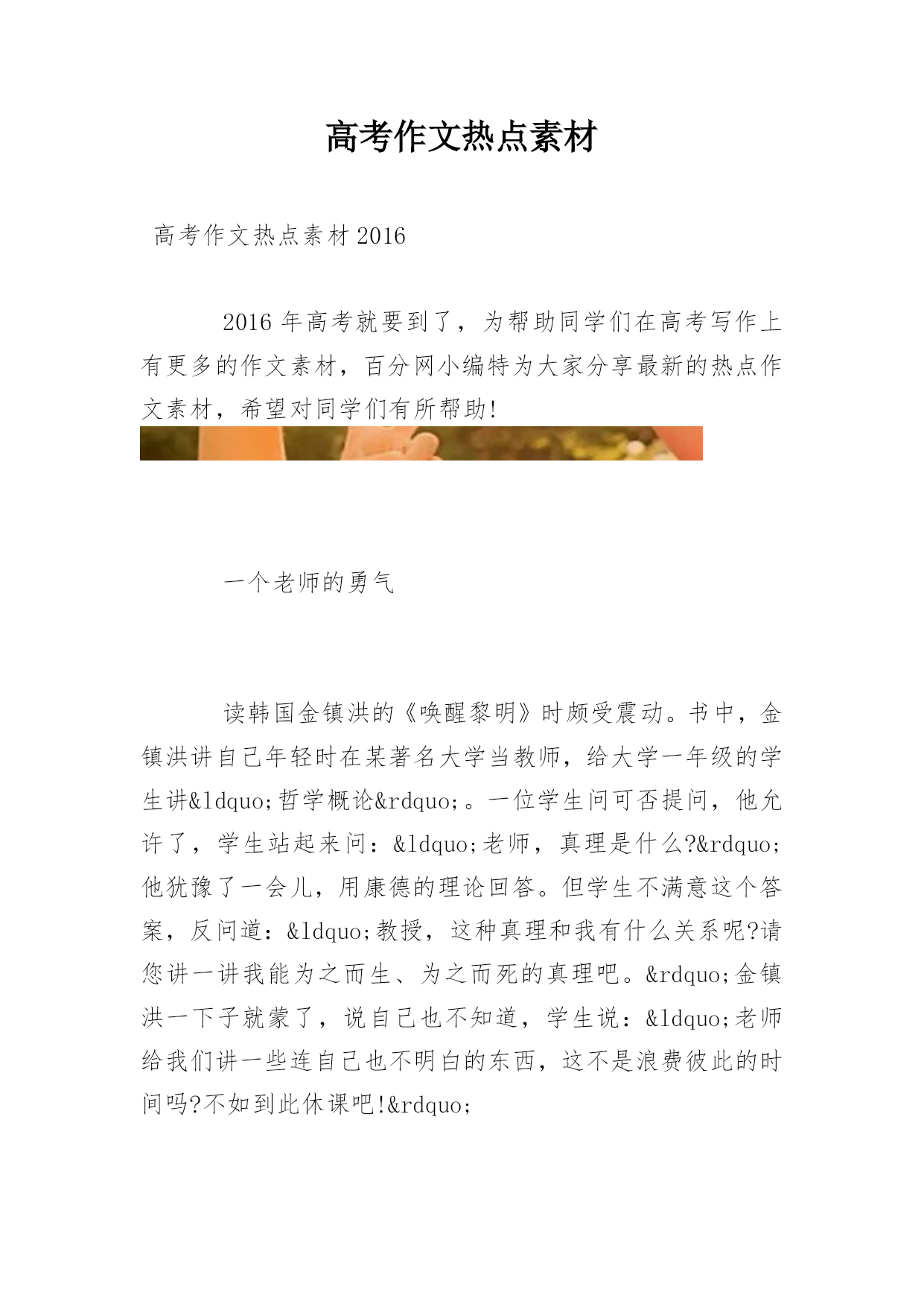 高考作文热点素材高考作文热点素材20162016年高考就要到了,为帮助同学们在高考写作上有更多的作文素材,百分网小编特为大家分享最新的热点作文素材,希望对同学们有所帮助!一个老师的勇气读韩国金镇洪的《唤醒黎明》时颇受震动。书中,金镇洪讲自己年轻时在某著名大学当教师,给大学一年级的学生讲“哲学概论”。一位学生问可否提问,他允许了,学生站起来问:“老师,真理是什么?”他犹豫了一会儿,用康德的理论回答。但学生不满意这个答案,反问道:“教授,这种真理和我