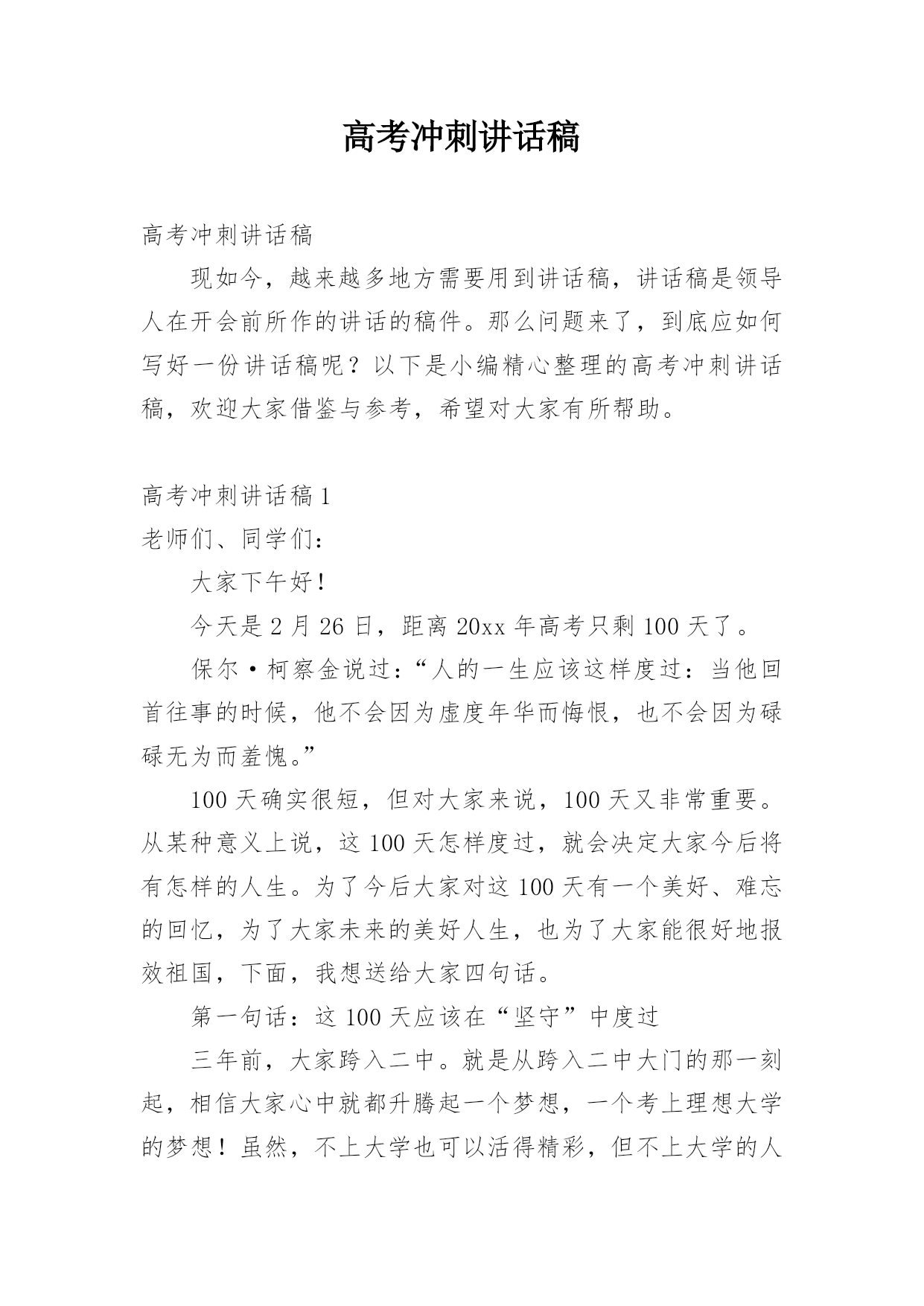 高考冲刺讲话稿高考冲刺讲话稿现如今,越来越多地方需要用到讲话稿,讲话稿是领导人在开会前所作的讲话的稿件。那么问题来了,到底应如何写好一份讲话稿呢?以下是小编精心整理的高考冲刺讲话稿,欢迎大家借鉴与参考,希望对大家有所帮助。高考冲刺讲话稿1老师们、同学们:大家下午好!今天是2月26日,距离20xx年高考只剩100天了。保尔·柯察金说过:“人的一生应该这样度过:当他回首往事的时候,他不会因为虚度年华而悔恨,也不会因为碌碌无为而羞愧。”100天确实很短,但对大家来说,100天又非常重要。从某种意义上说,这100