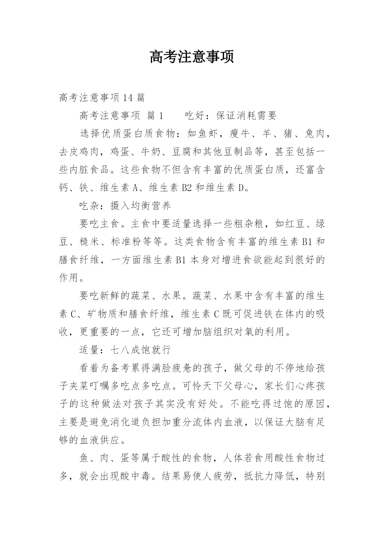 高考注意事项高考注意事项14篇高考注意事项篇1吃好:保证消耗需要选择优质蛋白质食物:如鱼虾,瘦牛、羊、猪、兔肉,去皮鸡肉,鸡蛋、牛奶、豆腐和其他豆制品等,甚至包括一些内脏食品。这些食物不但含有丰富的优质蛋白质,还富含钙、铁、维生素A、维生素B2和维生素D。吃杂:摄入均衡营养要吃主食。主食中要适量选择一些粗杂粮,如红豆、绿豆、糙米、标准粉等等。这类食物含有丰富的维生素B1和膳食纤维,一方面维生素B1本身对增进食欲能起到很好的作用。要吃新鲜的蔬菜、水果。蔬菜、水果中含有丰富的维生素C、矿物质和膳食纤维,维生素
