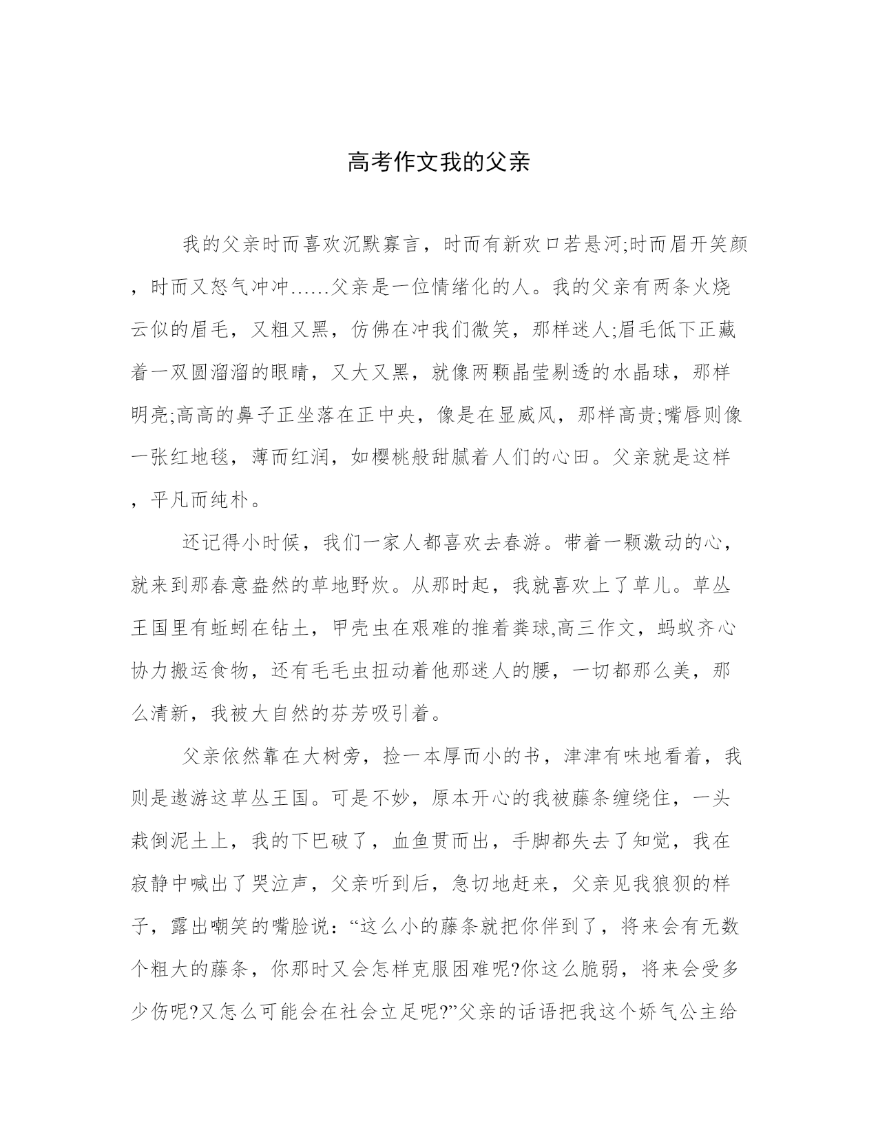 高考作文我的父亲我的父亲时而喜欢沉默寡言,时而有新欢口若悬河;时而眉开笑颜,时而又怒气冲冲……父亲是一位情绪化的人。我的父亲有两条火烧云似的眉毛,又粗又黑,仿佛在冲我们微笑,那样迷人;眉毛低下正藏着一双圆溜溜的眼睛,又大又黑,就像两颗晶莹剔透的水晶球,那样明亮;高高的鼻子正坐落在正中央,像是在显威风,那样高贵;嘴唇则像一张红地毯,薄而红润,如樱桃般甜腻着人们的心田。父亲就是这样,平凡而纯朴。还记得小时候,我们一家人都喜欢去春游。带着一颗激动的心,就来到那春意盎然的草地野炊。从那时起,我就喜欢上了草儿。草丛