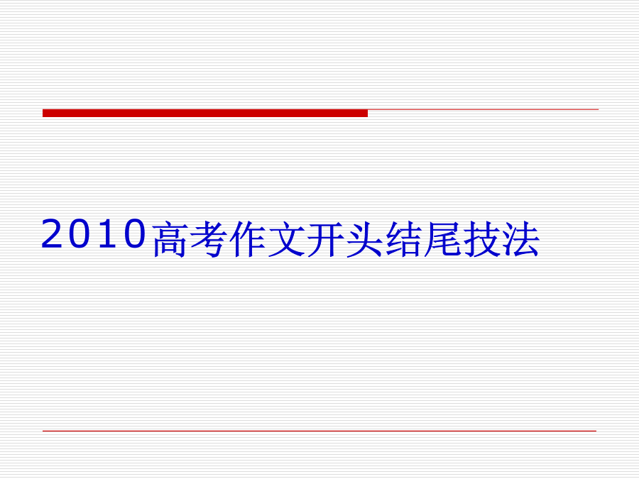 2010高考作文开头结尾技法关于开头常见开头技法种种开门见山引文入题,典雅厚重引用名言,凸现文采诗词开篇,凸显底蕴排比入题,先声夺人运用修辞格开篇,营造一种氛围,引人入胜.警句突现,启迪入题整散交错,灵巧入题细腻描绘,形象入题对话开篇,引人入胜事例开篇,简洁铺陈对称开篇,整齐明快梯式开头,突出视觉抒情开篇,拨动读者心弦,烘托渲染气氛,引出所叙说的人和事。设置疑问,引起读者注意,急于卒读。开头:“坐在窗边细细地品着一盏龙井,漫不经心地翻着一打报刊,感觉生活是如此美丽。无意间翻到一篇令人触目惊心的报道:一名中