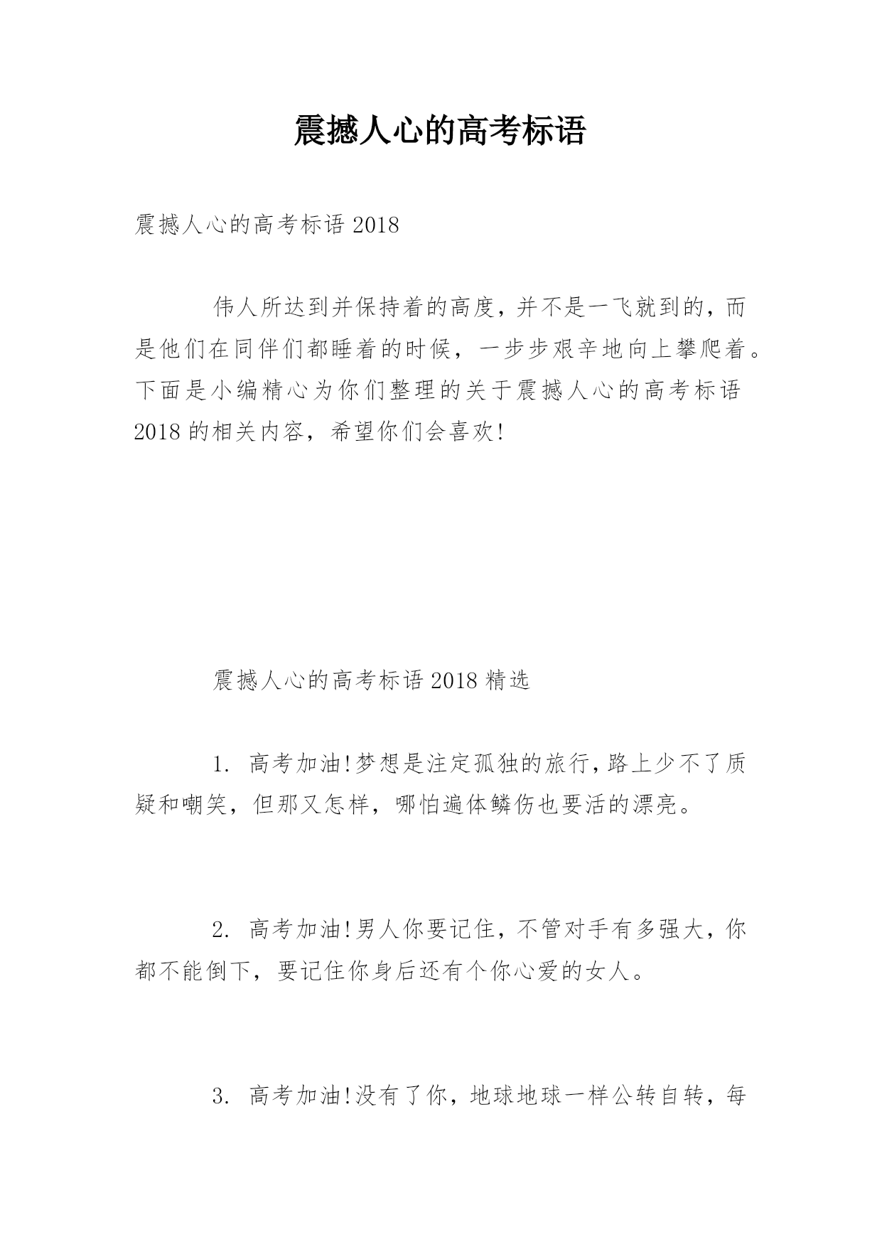 震撼人心的高考标语震撼人心的高考标语2018伟人所达到并保持着的高度,并不是一飞就到的,而是他们在同伴们都睡着的时候,一步步艰辛地向上攀爬着。下面是小编精心为你们整理的关于震撼人心的高考标语2018的相关内容,希望你们会喜欢!震撼人心的高考标语2018精选1.高考加油!梦想是注定孤独的旅行,路上少不了质疑和嘲笑,但那又怎样,哪怕遍体鳞伤也要活的漂亮。2.高考加油!男人你要记住,不管对手有多强大,你都不能倒下,要记住你身后还有个你心爱的女人。3.高考加油!没有了你,地球地球一样公转自转,每天早上起来抬头看,