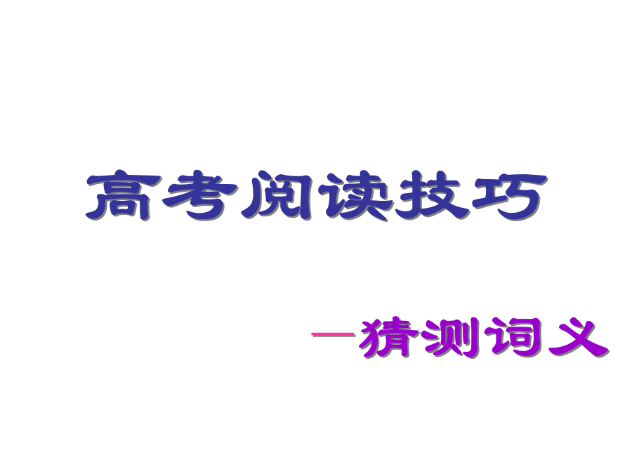 高考阅读技巧—猜测词义考纲要求墙角数枝槑,凌寒独自开,遥赞它是雪,只能说你呆。Ifyoucomeacrossnewwordswhenreading,猜测词义猜测词义题目类型(2011佛山一模C)WhensomeoneclickstheAPOLOGYbuttonandthewords“I’msorry”flashonyourscreen,allyouhavetodoisclickbacktheFORGIVENESSbutton.Itmeansthatyouhavewholeheartedlyaccepted
