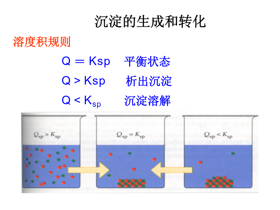 沉淀的生成和转化溶度积规则Q=Ksp平衡状态Q>Ksp析出沉淀Q<Ksp沉淀溶解(2011浙江13)海水中含有丰富的镁资源。某同学设计了从模拟海水中制备MgO的实验方案:注:溶液中某种离子的浓度小于1.0×10-5mol/L,可认为该离子不存在;实验过程中,假设溶液体积不变。已知:Ksp(CaCO3)=4.96×10-9;Ksp(MgCO3)=6.82×10-6;Ksp[Ca(OH)2]=4.68×10-6;Ksp[Mg(OH)2]=5.61×10-12。下列说法正确的是A.沉淀物X为CaCO3B.滤液M