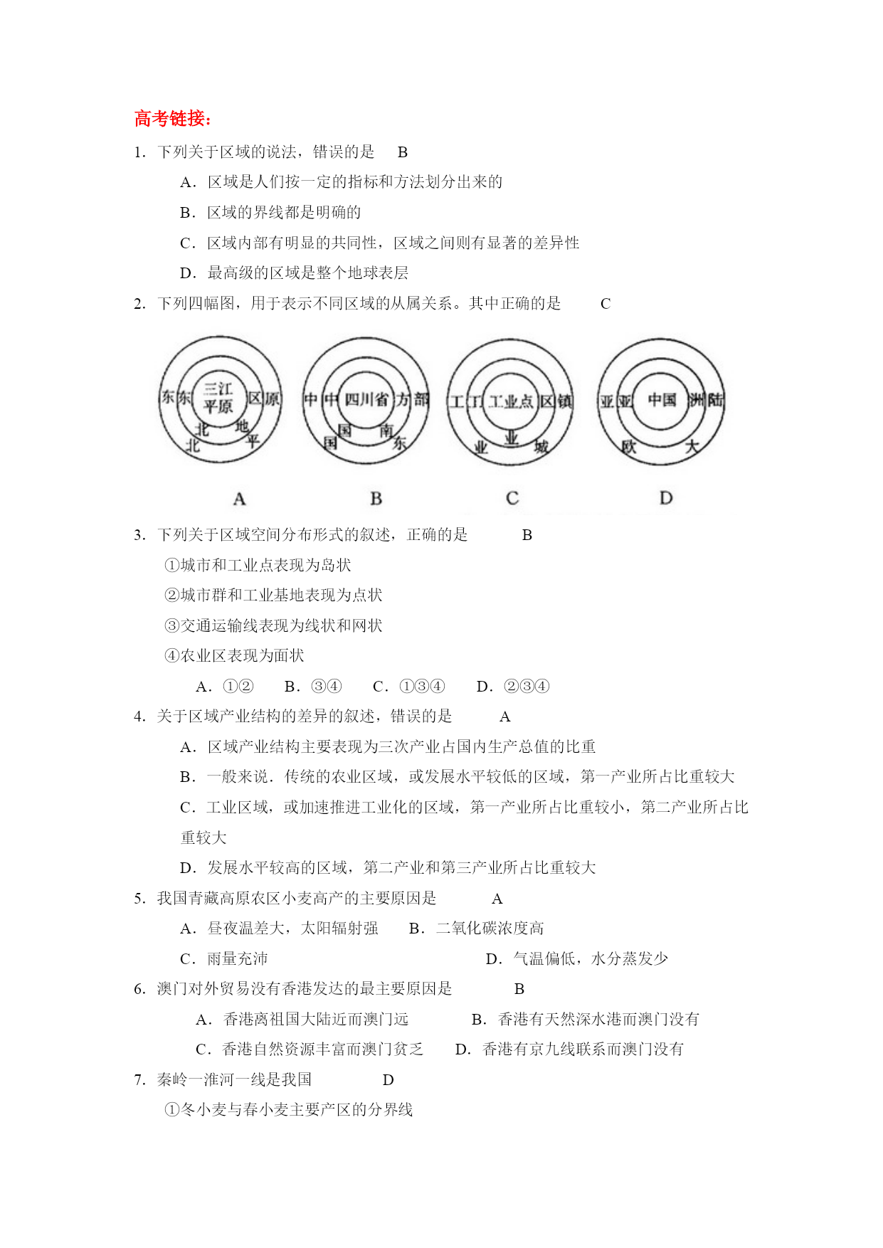 高考链接:1.下列关于区域的说法,错误的是BA.区域是人们按一定的指标和方法划分出来的HYPERLINK"file:///E:\\高中课件\\湘教版必修3\\files\\gaokaolianjie\\A0101.htm"\l"aaab#aaab"B.区域的界线都是明确的C.区域内部有明显的共同性,区域之间则有显著的差异性D.最高级的区域是整个地球表层【解析】此题考查的是区域的概念。有的区域界线是模糊的,例如气候区、植被区。另外,区域界线是明确的,也是相对而言的,例如严格划定的国界,从漫长的历史进程
