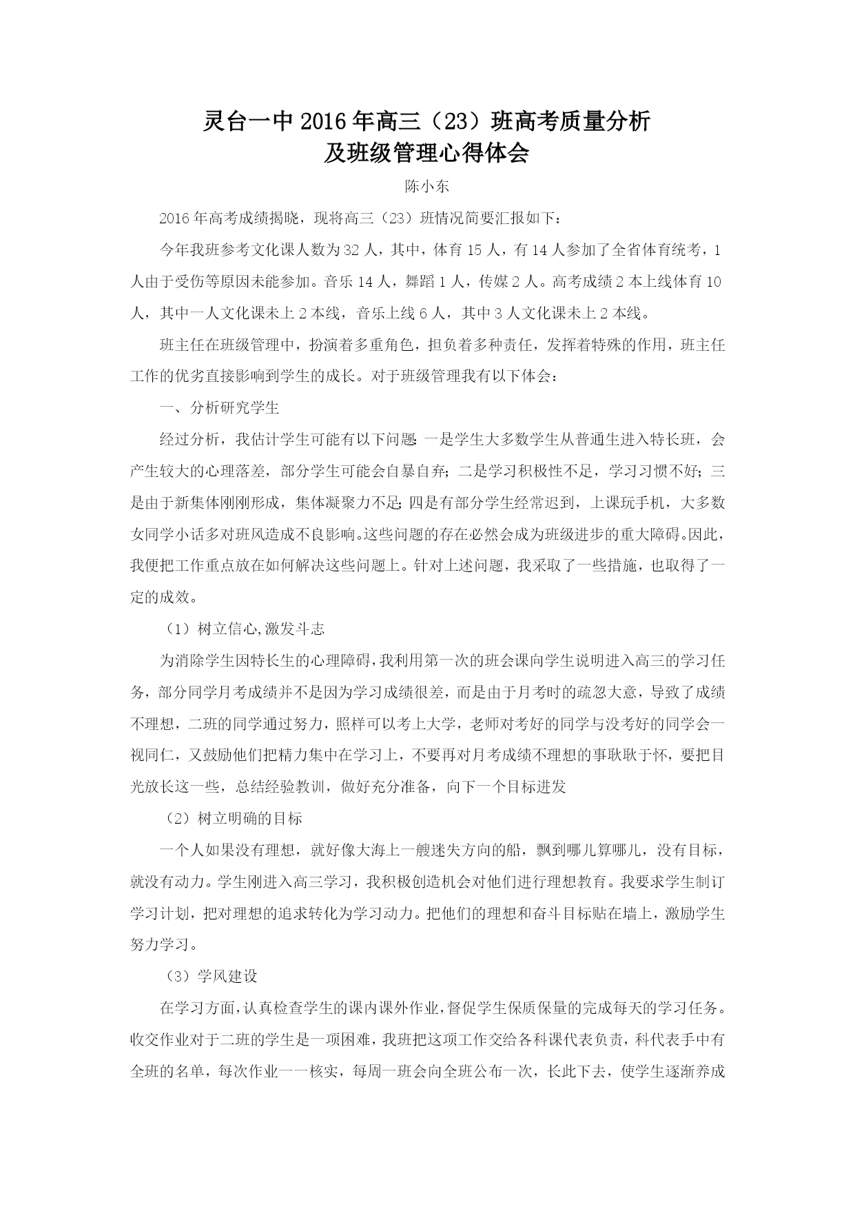 灵台一中2016年高三(23)班高考质量分析及班级管理心得体会陈小东2016年高考成绩揭晓,现将高三(23)班情况简要汇报如下:今年我班参考文化课人数为32人,其中,体育15人,有14人参加了全省体育统考,1人由于受伤等原因未能参加。音乐14人,舞蹈1人,传媒2人。高考成绩2本上线体育10人,其中一人文化课未上2本线,音乐上线6人,其中3人文化课未上2本线。班主任在班级管理中,扮演着多重角色,担负着多种责任,发挥着特殊的作用,班主任工作的优劣直接影响到学生的成长。对于班级管理我有以下体会:一、分析研究学生