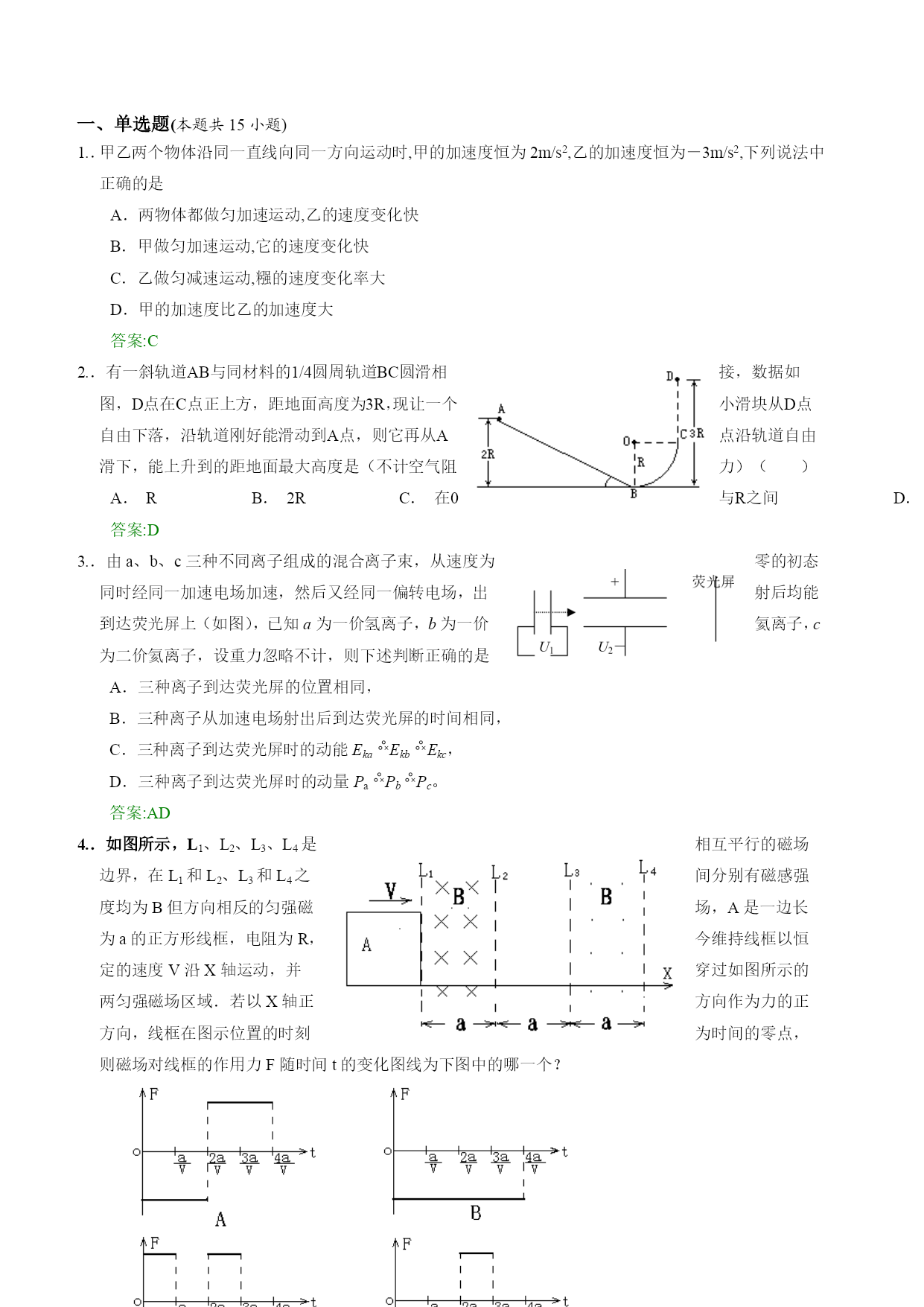一、单选题(本题共15小题)AUTONUM.甲乙两个物体沿同一直线向同一方向运动时,甲的加速度恒为2m/s2,乙的加速度恒为-3m/s2,下列说法中正确的是A.两物体都做匀加速运动,乙的速度变化快B.甲做匀加速运动,它的速度变化快C.乙做匀减速运动,糨的速度变化率大D.甲的加速度比乙的加速度大答案:CAUTONUM.有一斜轨道AB与同材料的1/4圆周轨道BC圆滑相接,数据如图,D点在C点正上方,距地面高度为3R,现让一个小滑块从D点自由下落,沿轨道刚好能滑动到A点,则它再从A点沿轨道自由滑下,能上