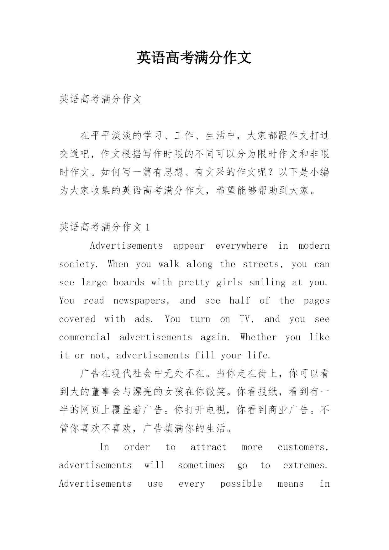 英语高考满分作文英语高考满分作文在平平淡淡的学习、工作、生活中,大家都跟作文打过交道吧,作文根据写作时限的不同可以分为限时作文和非限时作文。如何写一篇有思想、有文采的作文呢?以下是小编为大家收集的英语高考满分作文,希望能够帮助到大家。英语高考满分作文1Advertisementsappeareverywhereinmodernsociety.Whenyouwalkalongthestreets,youcanseelargeboardswithprettygirlssmilingatyou.Youreadn