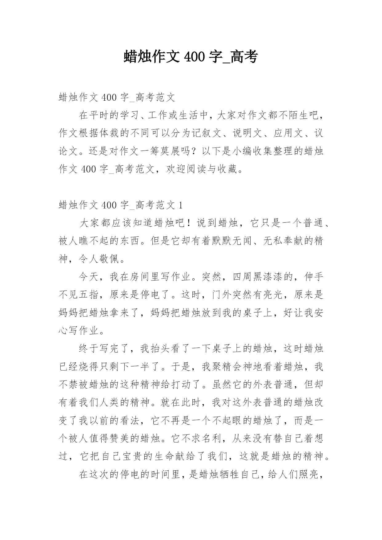 蜡烛作文400字_高考蜡烛作文400字_高考范文在平时的学习、工作或生活中,大家对作文都不陌生吧,作文根据体裁的不同可以分为记叙文、说明文、应用文、议论文。还是对作文一筹莫展吗?以下是小编收集整理的蜡烛作文400字_高考范文,欢迎阅读与收藏。蜡烛作文400字_高考范文1大家都应该知道蜡烛吧!说到蜡烛,它只是一个普通、被人瞧不起的东西。但是它却有着默默无闻、无私奉献的精神,令人敬佩。今天,我在房间里写作业。突然,四周黑漆漆的,伸手不见五指,原来是停电了。这时,门外突然有亮光,原来是妈妈把蜡烛拿来了,妈妈把蜡