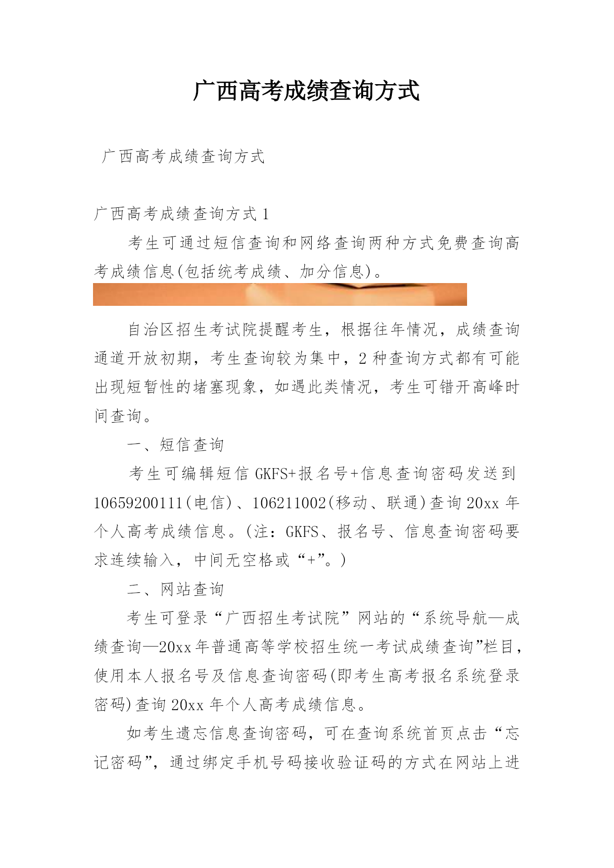 广西高考成绩查询方式广西高考成绩查询方式广西高考成绩查询方式1考生可通过短信查询和网络查询两种方式免费查询高考成绩信息(包括统考成绩、加分信息)。自治区招生考试院提醒考生,根据往年情况,成绩查询通道开放初期,考生查询较为集中,2种查询方式都有可能出现短暂性的堵塞现象,如遇此类情况,考生可错开高峰时间查询。一、短信查询考生可编辑短信GKFS+报名号+信息查询密码发送到10659200111(电信)、106211002(移动、联通)查询20xx年个人高考成绩信息。(注:GKFS、报名号、信息查询密码要求连续输