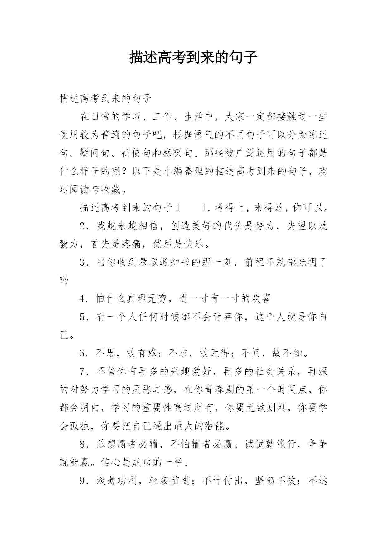 描述高考到来的句子描述高考到来的句子在日常的学习、工作、生活中,大家一定都接触过一些使用较为普遍的句子吧,根据语气的不同句子可以分为陈述句、疑问句、祈使句和感叹句。那些被广泛运用的句子都是什么样子的呢?以下是小编整理的描述高考到来的句子,欢迎阅读与收藏。描述高考到来的句子11.考得上,来得及,你可以。2.我越来越相信,创造美好的代价是努力,失望以及毅力,首先是疼痛,然后是快乐。3.当你收到录取通知书的那一刻,前程不就都光明了吗4.怕什么真理无穷,进一寸有一寸的欢喜5.有一个人任何时候都不会背弃你,这个人就