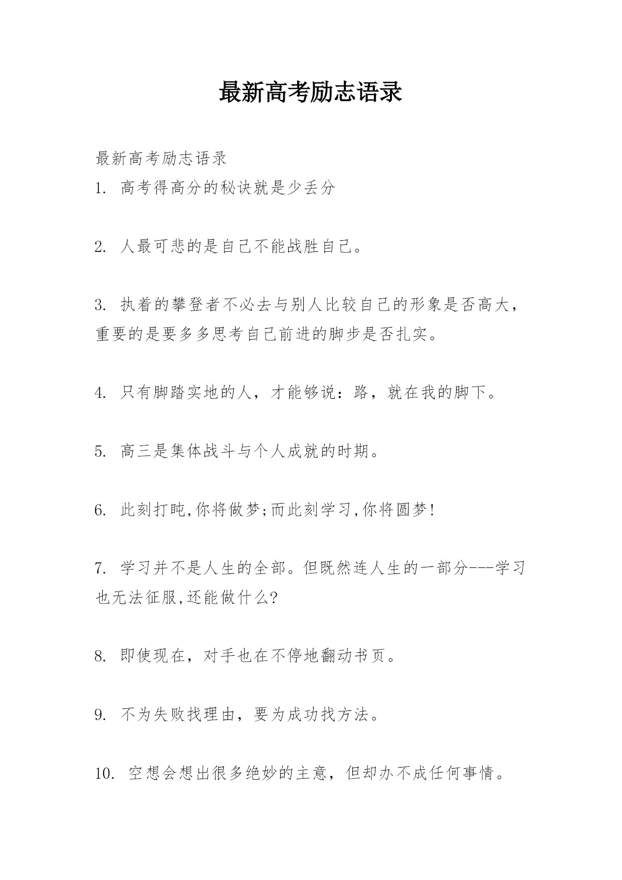 最新高考励志语录最新高考励志语录1.高考得高分的秘诀就是少丢分2.人最可悲的是自己不能战胜自己。3.执着的攀登者不必去与别人比较自己的形象是否高大,重要的是要多多思考自己前进的脚步是否扎实。4.只有脚踏实地的人,才能够说:路,就在我的脚下。5.高三是集体战斗与个人成就的时期。6.此刻打盹,你将做梦;而此刻学习,你将圆梦!7.学习并不是人生的全部。但既然连人生的一部分---学习也无法征服,还能做什么?8.即使现在,对手也在不停地翻动书页。9.不为失败找理由,要为成功找方法。10.空想会想出很多绝妙的主意,但
