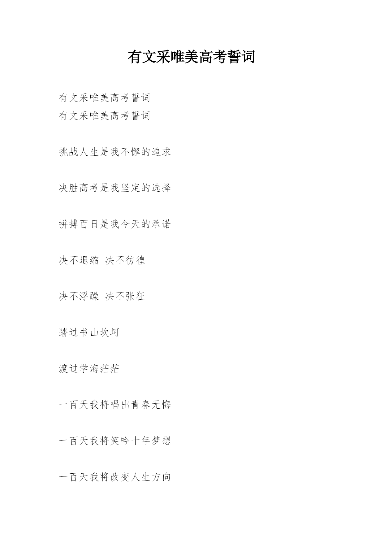 有文采唯美高考誓词有文采唯美高考誓词有文采唯美高考誓词挑战人生是我不懈的追求决胜高考是我坚定的选择拼搏百日是我今天的承诺决不退缩决不彷徨决不浮躁决不张狂踏过书山坎坷渡过学海茫茫一百天我将唱出青春无悔一百天我将笑吟十年梦想一百天我将改变人生方向一百天我要蚕蛹化蝶凤凰涅槃让雄心与智慧在六月闪光有文采唯美高考誓词从今天起,我们就站上了高考的跑道。面对挑战,我们庄严宣誓:遵守纪律,自信自强;勤学苦练,斗志昂扬;目标明确,积极向上;讲究方法,保质保量;争分夺秒,适度紧张;调节身心,全面成长。挑战人生,是我坚定的信念