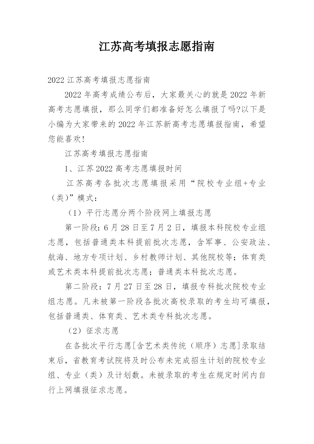 江苏高考填报志愿指南2022江苏高考填报志愿指南2022年高考成绩公布后,大家最关心的就是2022年新高考志愿填报,那么同学们都准备好怎么填报了吗?以下是小编为大家带来的2022年江苏新高考志愿填报指南,希望您能喜欢!江苏高考填报志愿指南1、江苏2022高考志愿填报时间江苏高考各批次志愿填报采用“院校专业组+专业(类)”模式:(1)平行志愿分两个阶段网上填报志愿第一阶段:6月28日至7月2日,填报本科院校专业组志愿,包括普通类本科提前批次志愿,含军事、公安政法、航海、地方专项计划、乡村教师计划、其他院校等