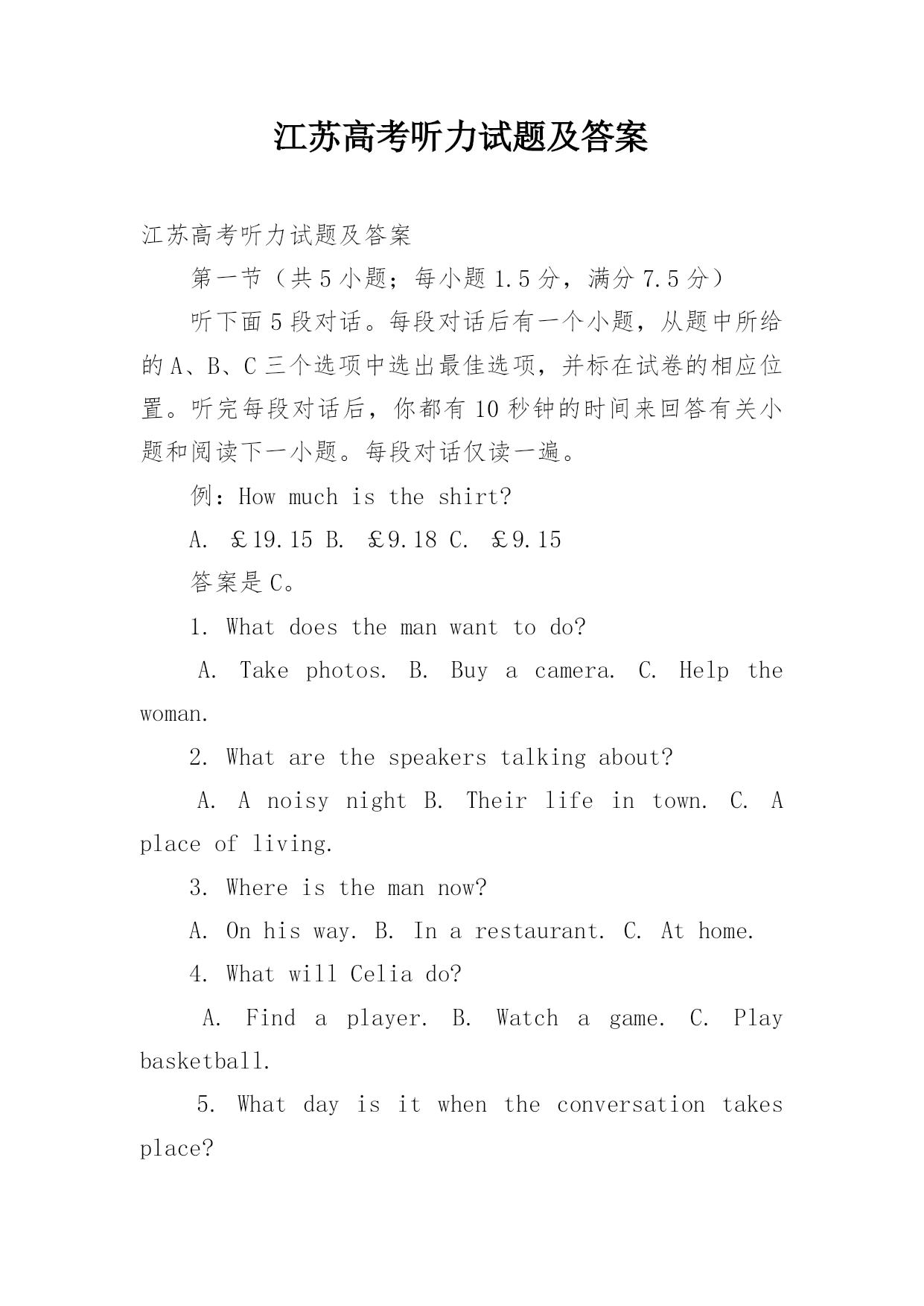 江苏高考听力试题及答案江苏高考听力试题及答案第一节(共5小题;每小题1.5分,满分7.5分)听下面5段对话。每段对话后有一个小题,从题中所给的A、B、C三个选项中选出最佳选项,并标在试卷的相应位置。听完每段对话后,你都有10秒钟的时间来回答有关小题和阅读下一小题。每段对话仅读一遍。例:Howmuchistheshirt?A.£19.15B.£9.18C.£9.15答案是C。1.Whatdoesthemanwanttodo?A.Takephotos.B.Buyacamera.C.Helpthewoman.2