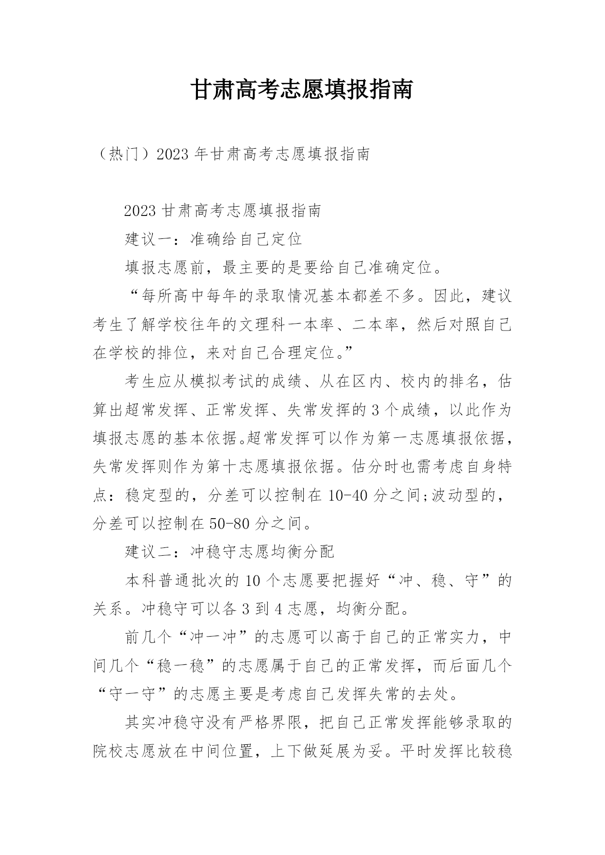 甘肃高考志愿填报指南(热门)2023年甘肃高考志愿填报指南2023甘肃高考志愿填报指南建议一:准确给自己定位填报志愿前,最主要的是要给自己准确定位。“每所高中每年的录取情况基本都差不多。因此,建议考生了解学校往年的文理科一本率、二本率,然后对照自己在学校的排位,来对自己合理定位。”考生应从模拟考试的成绩、从在区内、校内的排名,估算出超常发挥、正常发挥、失常发挥的3个成绩,以此作为填报志愿的基本依据。超常发挥可以作为第一志愿填报依据,失常发挥则作为第十志愿填报依据。估分时也需考虑自身特点:稳定型的,分差可以