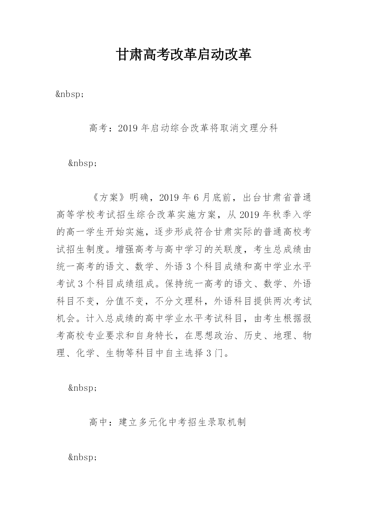 甘肃高考改革启动改革 高考:2019年启动综合改革将取消文理分科 《方案》明确,2019年6月底前,出台甘肃省普通高等学校考试招生综合改革实施方案,从2019年秋季入学的高一学生开始实施,逐步形成符合甘肃实际的普通高校考试招生制度。增强高考与高中学习的关联度,考生总成绩由统一高考的语文、数学、外语3个科目成绩和高中学业水平考试3个科目成绩组成。保持统一高考的语文、数学、外语科目不变,分值不变,不分文理科,外语科目提供两次考试机会。计入总成绩的高中学业水平考试科目,由考生根据报考高校专业