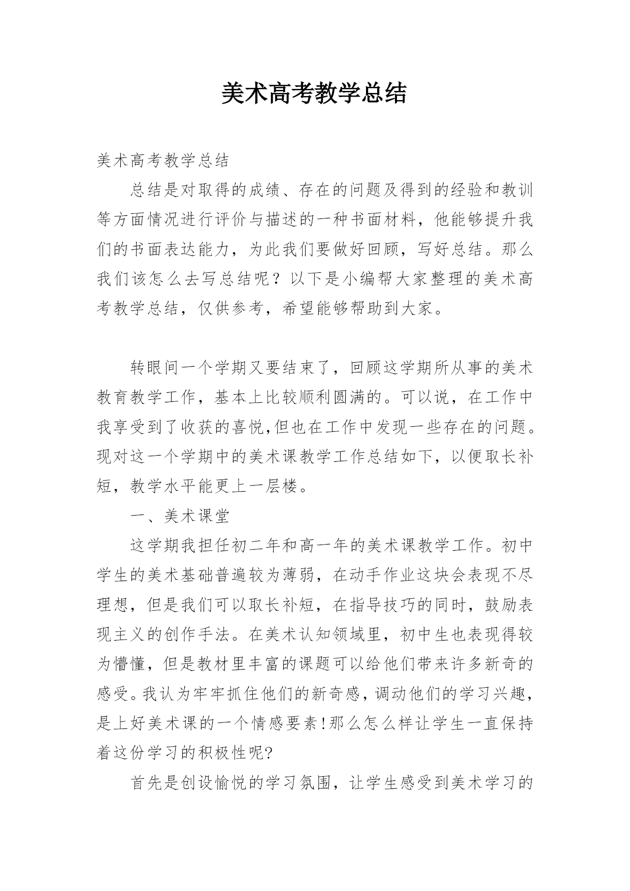 美术高考教学总结美术高考教学总结总结是对取得的成绩、存在的问题及得到的经验和教训等方面情况进行评价与描述的一种书面材料,他能够提升我们的书面表达能力,为此我们要做好回顾,写好总结。那么我们该怎么去写总结呢?以下是小编帮大家整理的美术高考教学总结,仅供参考,希望能够帮助到大家。转眼间一个学期又要结束了,回顾这学期所从事的美术教育教学工作,基本上比较顺利圆满的。可以说,在工作中我享受到了收获的喜悦,但也在工作中发现一些存在的问题。现对这一个学期中的美术课教学工作总结如下,以便取长补短,教学水平能更上一层楼。一