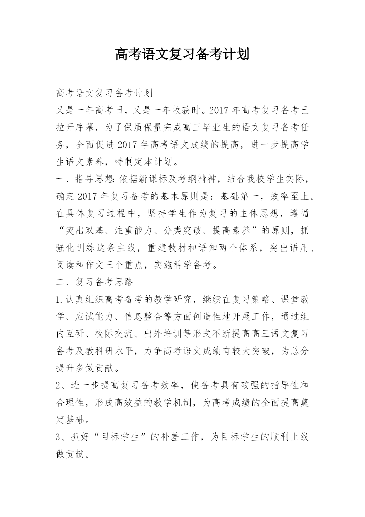 高考语文复习备考计划高考语文复习备考计划又是一年高考日,又是一年收获时。2017年高考复习备考已拉开序幕,为了保质保量完成高三毕业生的语文复习备考任务,全面促进2017年高考语文成绩的提高,进一步提高学生语文素养,特制定本计划。一、指导思想:依据新课标及考纲精神,结合我校学生实际,确定2017年复习备考的基本原则是:基础第一,效率至上。在具体复习过程中,坚持学生作为复习的主体思想,遵循“突出双基、注重能力、分类突破、提高素养”的原则,抓强化训练这条主线,重建教材和语知两个体系,突出语用、阅读和作文三个重点