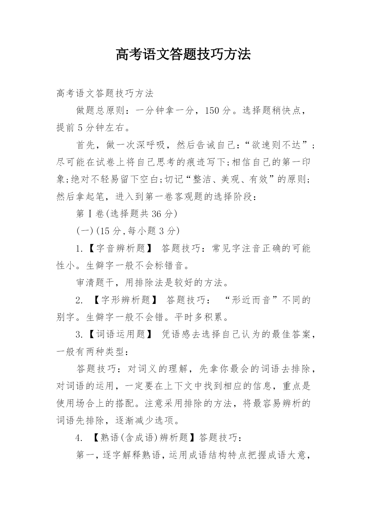 高考语文答题技巧方法高考语文答题技巧方法做题总原则:一分钟拿一分,150分。选择题稍快点,提前5分钟左右。首先,做一次深呼吸,然后告诫自己:“欲速则不达”;尽可能在试卷上将自己思考的痕迹写下;相信自己的第一印象;绝对不轻易留下空白;切记“整洁、美观、有效”的原则;然后拿起笔,进入到第一卷客观题的选择阶段:第Ⅰ卷(选择题共36分)(一)(15分,每小题3分)1.【字音辨析题】答题技巧:常见字注音正确的可能性小。生僻字一般不会标错音。审清题干,用排除法是较好的方法。2.【字形辨析题】答题技巧:“形近而音”不同