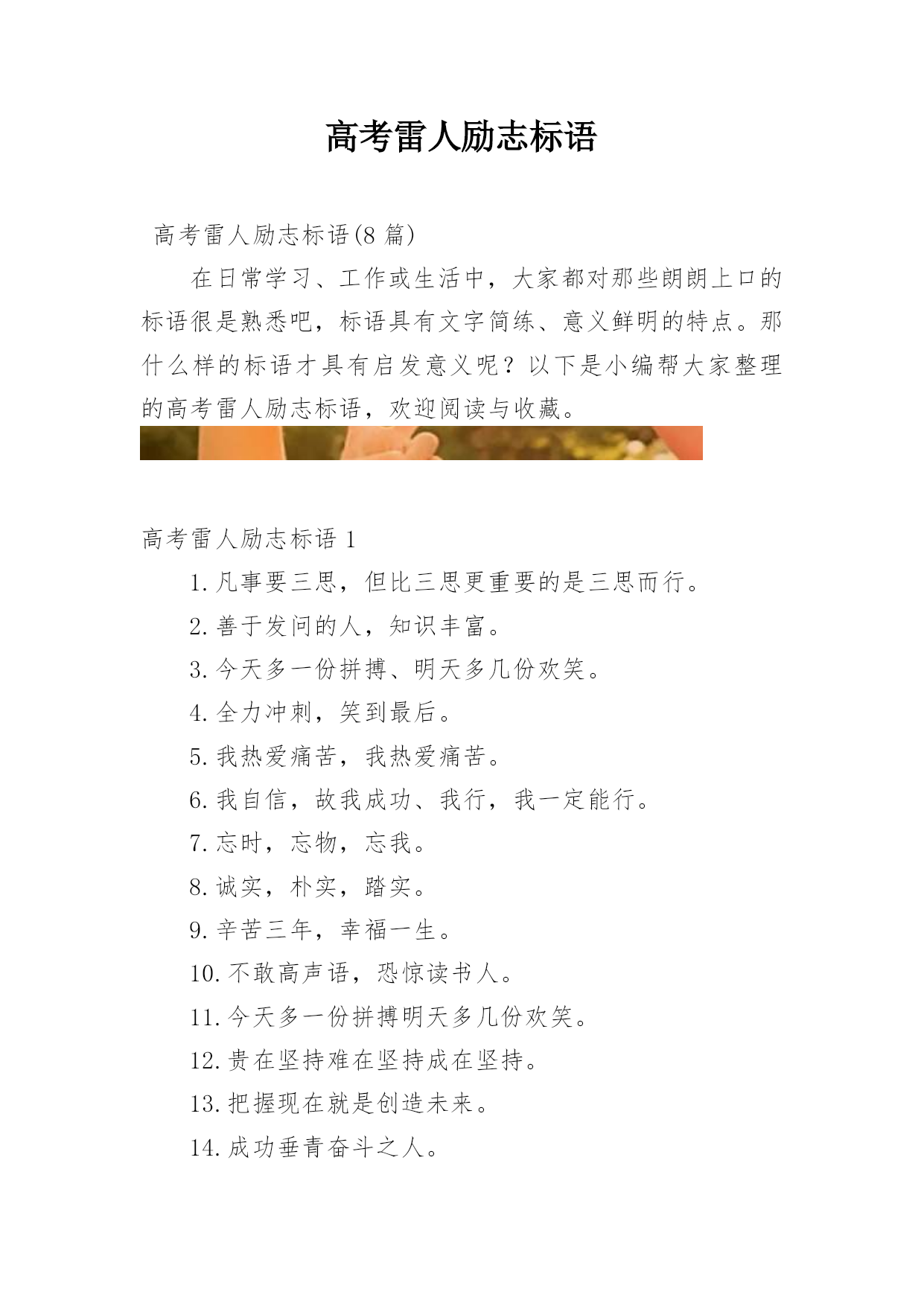 高考雷人励志标语高考雷人励志标语(8篇)在日常学习、工作或生活中,大家都对那些朗朗上口的标语很是熟悉吧,标语具有文字简练、意义鲜明的特点。那什么样的标语才具有启发意义呢?以下是小编帮大家整理的高考雷人励志标语,欢迎阅读与收藏。高考雷人励志标语11.凡事要三思,但比三思更重要的是三思而行。2.善于发问的人,知识丰富。3.今天多一份拼搏、明天多几份欢笑。4.全力冲刺,笑到最后。5.我热爱痛苦,我热爱痛苦。6.我自信,故我成功、我行,我一定能行。7.忘时,忘物,忘我。8.诚实,朴实,踏实。9.辛苦三年,幸福一生