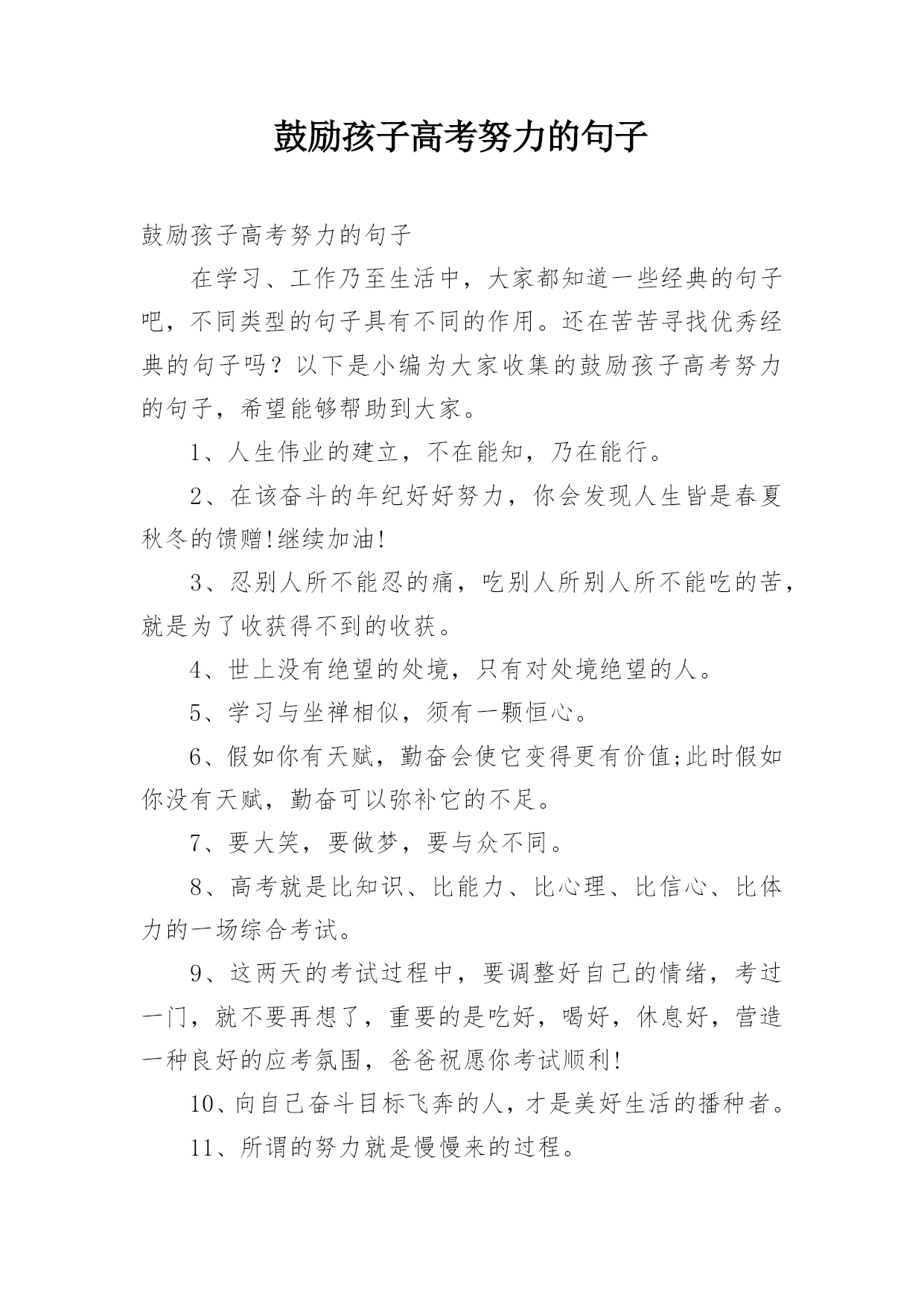 鼓励孩子高考努力的句子鼓励孩子高考努力的句子在学习、工作乃至生活中,大家都知道一些经典的句子吧,不同类型的句子具有不同的作用。还在苦苦寻找优秀经典的句子吗?以下是小编为大家收集的鼓励孩子高考努力的句子,希望能够帮助到大家。1、人生伟业的建立,不在能知,乃在能行。2、在该奋斗的年纪好好努力,你会发现人生皆是春夏秋冬的馈赠!继续加油!3、忍别人所不能忍的痛,吃别人所别人所不能吃的苦,就是为了收获得不到的收获。4、世上没有绝望的处境,只有对处境绝望的人。5、学习与坐禅相似,须有一颗恒心。6、假如你有天赋,勤奋会