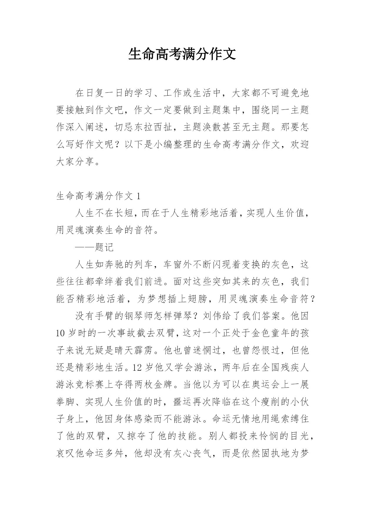 生命高考满分作文在日复一日的学习、工作或生活中,大家都不可避免地要接触到作文吧,作文一定要做到主题集中,围绕同一主题作深入阐述,切忌东拉西扯,主题涣散甚至无主题。那要怎么写好作文呢?以下是小编整理的生命高考满分作文,欢迎大家分享。生命高考满分作文1人生不在长短,而在于人生精彩地活着,实现人生价值,用灵魂演奏生命的音符。——题记人生如奔驰的列车,车窗外不断闪现着变换的灰色,这些往往都牵绊着我们前进。面对这些突如其来的灰色,我们能否精彩地活着,为梦想插上翅膀,用灵魂演奏生命音符?没有手臂的钢琴师怎样弹琴?刘伟