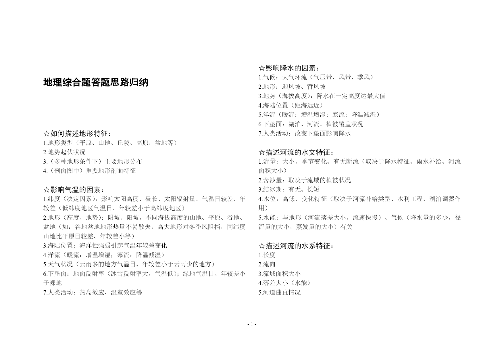 PAGE-11-地理综合题答题思路归纳☆如何描述地形特征:1.地形类型(平原、山地、丘陵、高原、盆地等)2.地势起伏状况3.(多种地形条件下)主要地形分布4.(剖面图中)重要地形剖面特征☆影响气温的因素:1.纬度(决定因素):影响太阳高度、昼长、太阳辐射量、气温日较差,年较差(低纬度地区气温日、年较差小于高纬度地区)2.地形(高度、地势):阴坡、阳坡,不同海拔高度的山地、平原、谷地、盆地(如:谷地盆地地形热量不易散失,高大地形对冬季风阻挡,同纬度山地比平原日较差、年较差小等)3.海陆位置:海洋性强弱