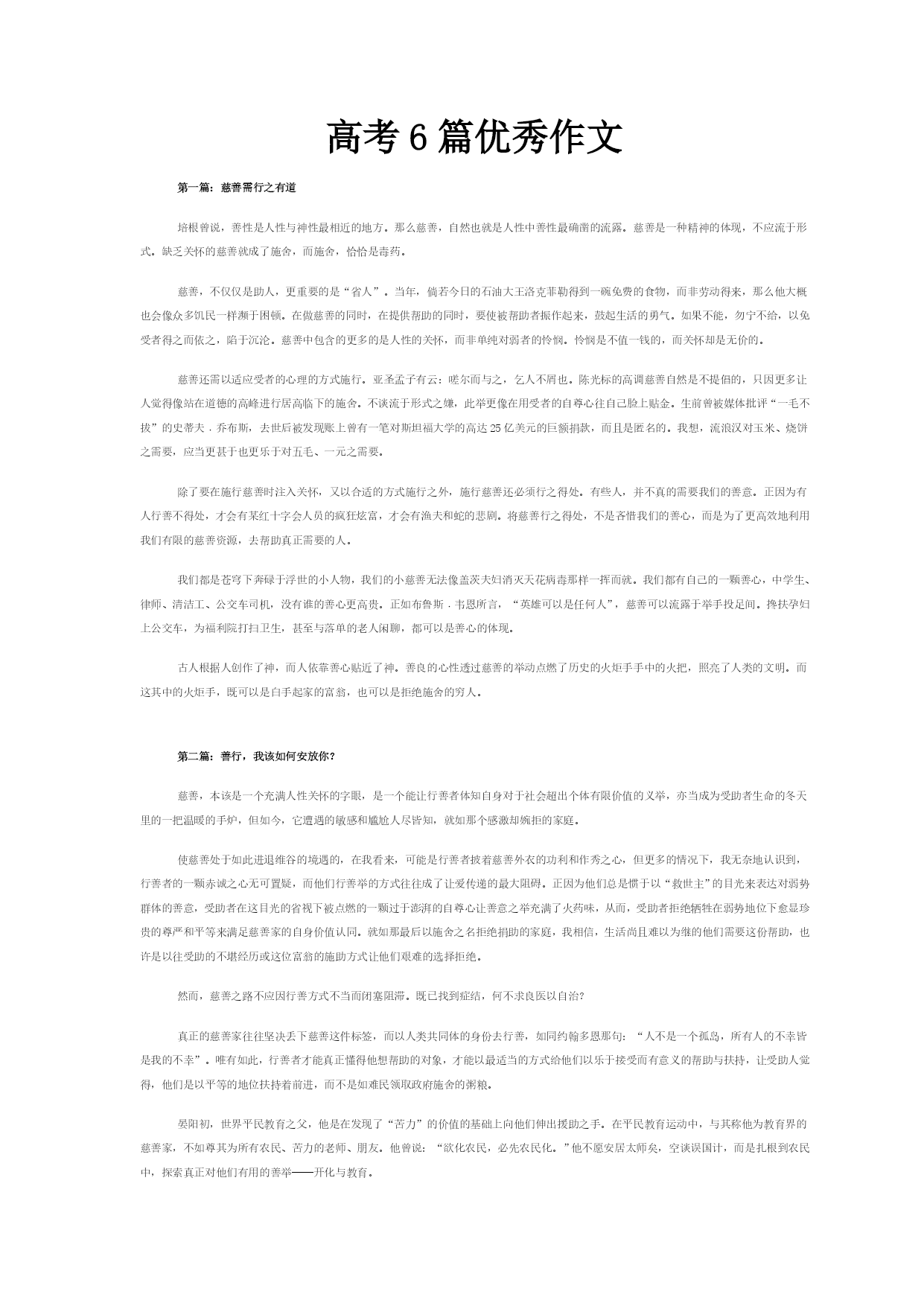 高考6篇优秀作文第一篇:慈善需行之有道培根曾说,善性是人性与神性最相近的地方。那么慈善,自然也就是人性中善性最确凿的流露。慈善是一种精神的体现,不应流于形式。缺乏关怀的慈善就成了施舍,而施舍,恰恰是毒药。慈善,不仅仅是助人,更重要的是“省人”。当年,倘若今日的石油大王洛克菲勒得到一碗免费的食物,而非劳动得来,那么他大概也会像众多饥民一样濒于困顿。在做慈善的同时,在提供帮助的同时,要使被帮助者振作起来,鼓起生活的勇气。如果不能,勿宁不给,以免受者得之而依之,陷于沉沦。慈善中包含的更多的是人性的关怀,而非单纯