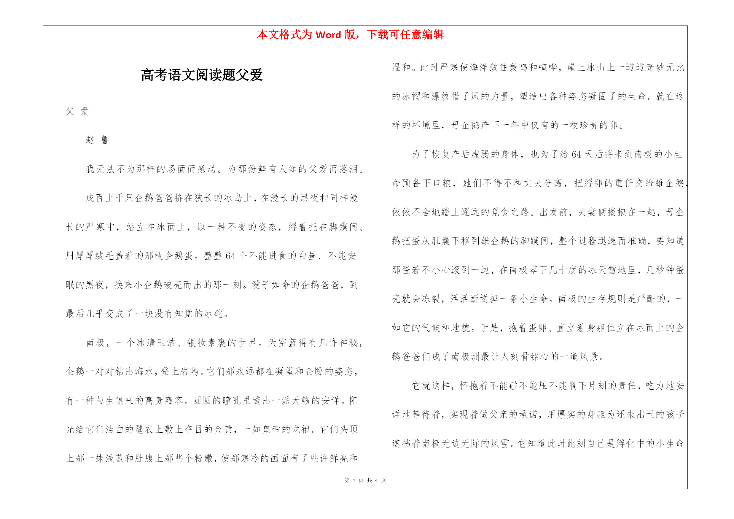 本文格式为Word版,下载可任意编辑第PAGE\*MERGEFORMAT4页共NUMPAGES\*MERGEFORMAT4页高考语文阅读题父爱父爱赵鲁我无法不为那样的场面而感动。为那份鲜有人知的父爱而落泪。成百上千只企鹅爸爸挤在狭长的冰岛上,在漫长的黑夜和同样漫长的严寒中,站立在冰面上,以一种不变的姿态,孵着托在脚蹼间、用厚厚绒毛盖着的那枚企鹅蛋。整整64个不能进食的白昼、不能安眠的黑夜,换来小企鹅破壳而出的那一刻。爱子如命的企鹅爸爸,到最后几乎变成了一块没有知觉的冰砣。南极,一个冰清玉洁、银