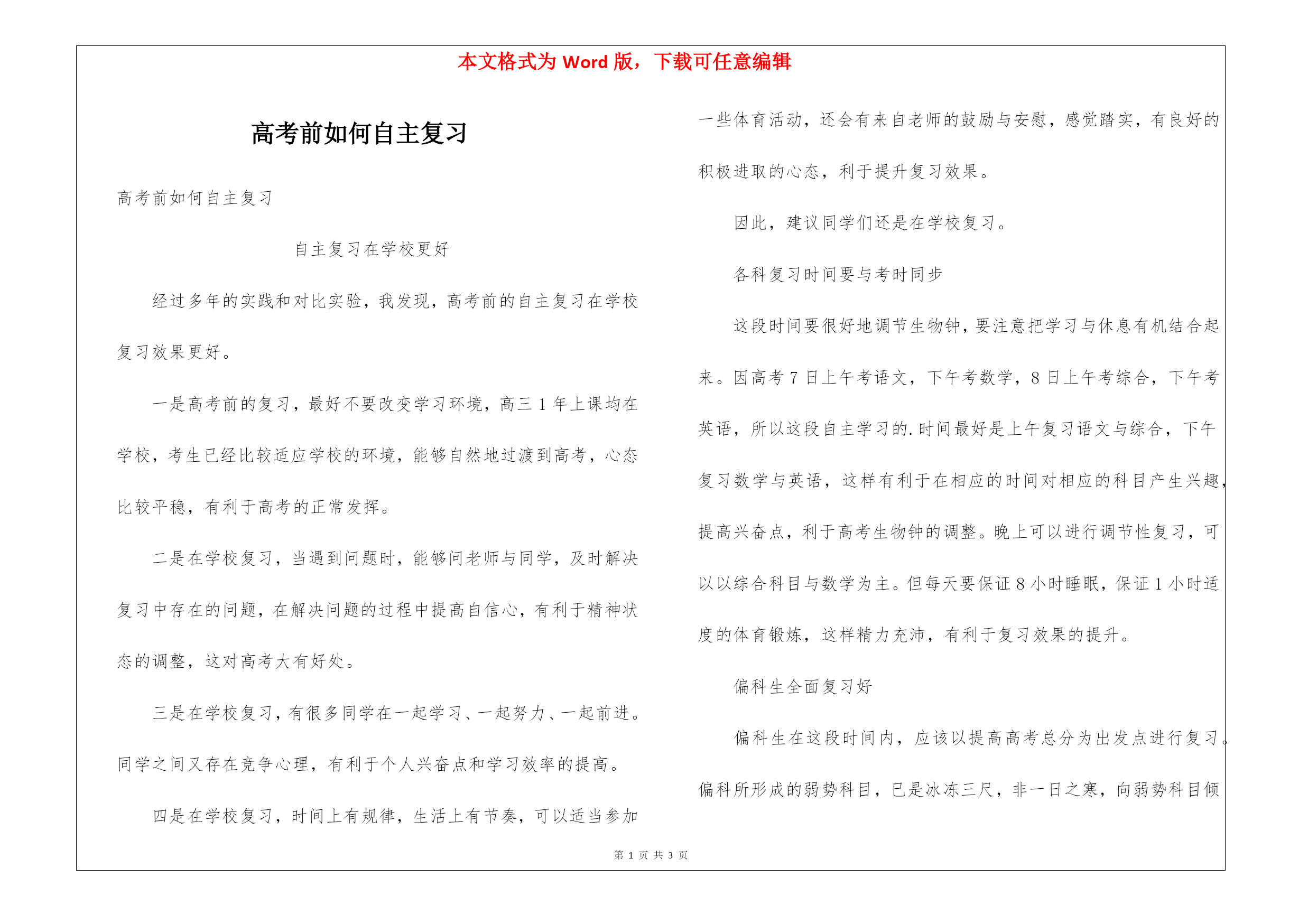 本文格式为Word版,下载可任意编辑第PAGE\*MERGEFORMAT3页共NUMPAGES\*MERGEFORMAT3页高考前如何自主复习高考前如何自主复习自主复习在学校更好经过多年的实践和对比实验,我发现,高考前的自主复习在学校复习效果更好。一是高考前的复习,最好不要改变学习环境,高三1年上课均在学校,考生已经比较适应学校的环境,能够自然地过渡到高考,心态比较平稳,有利于高考的正常发挥。二是在学校复习,当遇到问题时,能够问老师与同学,及时解决复习中存在的问题,在解决问题的过程中提高自信心
