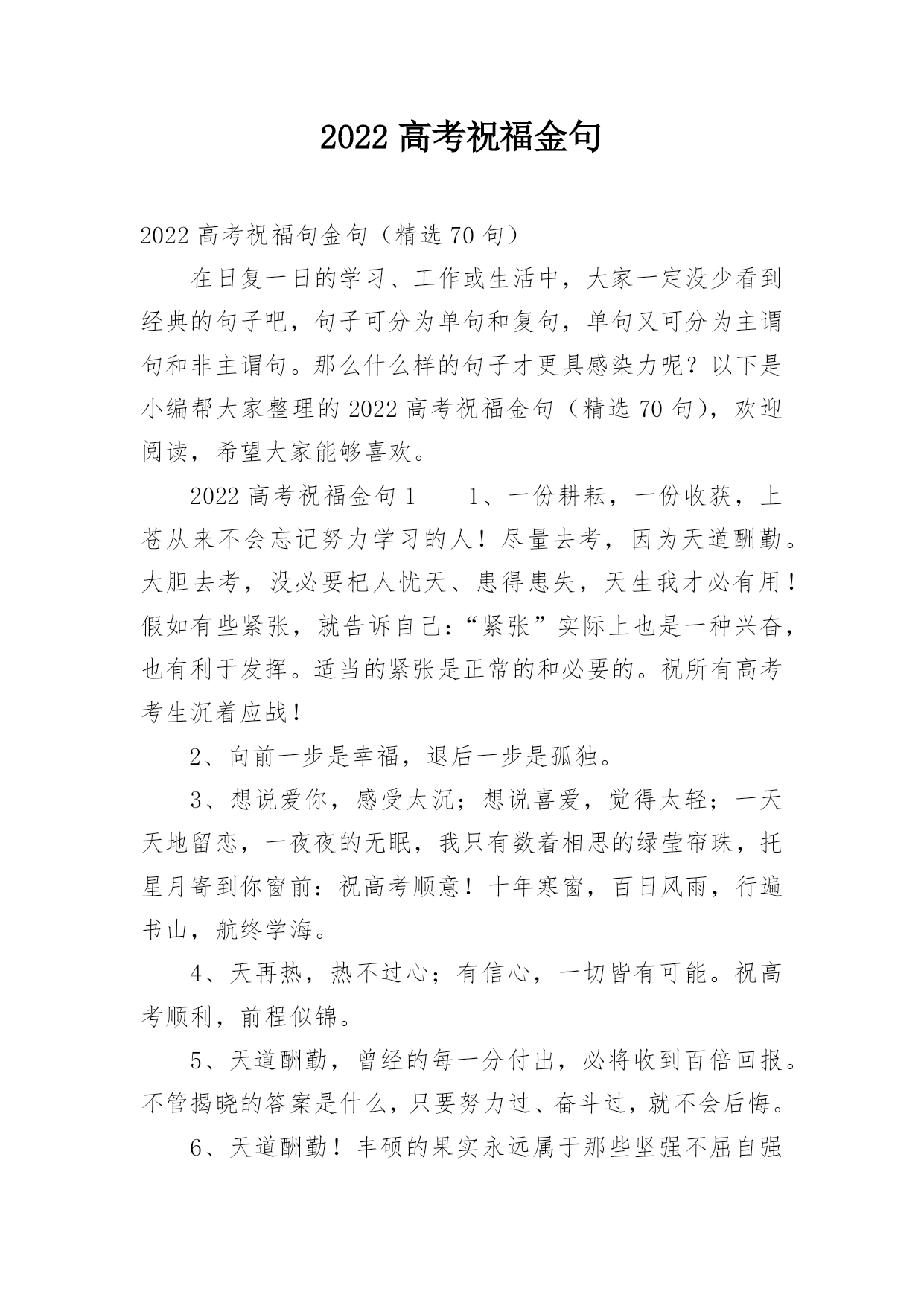 2022高考祝福金句2022高考祝福句金句(精选70句)在日复一日的学习、工作或生活中,大家一定没少看到经典的句子吧,句子可分为单句和复句,单句又可分为主谓句和非主谓句。那么什么样的句子才更具感染力呢?以下是小编帮大家整理的2022高考祝福金句(精选70句),欢迎阅读,希望大家能够喜欢。2022高考祝福金句11、一份耕耘,一份收获,上苍从来不会忘记努力学习的人!尽量去考,因为天道酬勤。大胆去考,没必要杞人忧天、患得患失,天生我才必有用!假如有些紧张,就告诉自己:“紧张”实际上也是一种兴奋,也有利于发挥。适