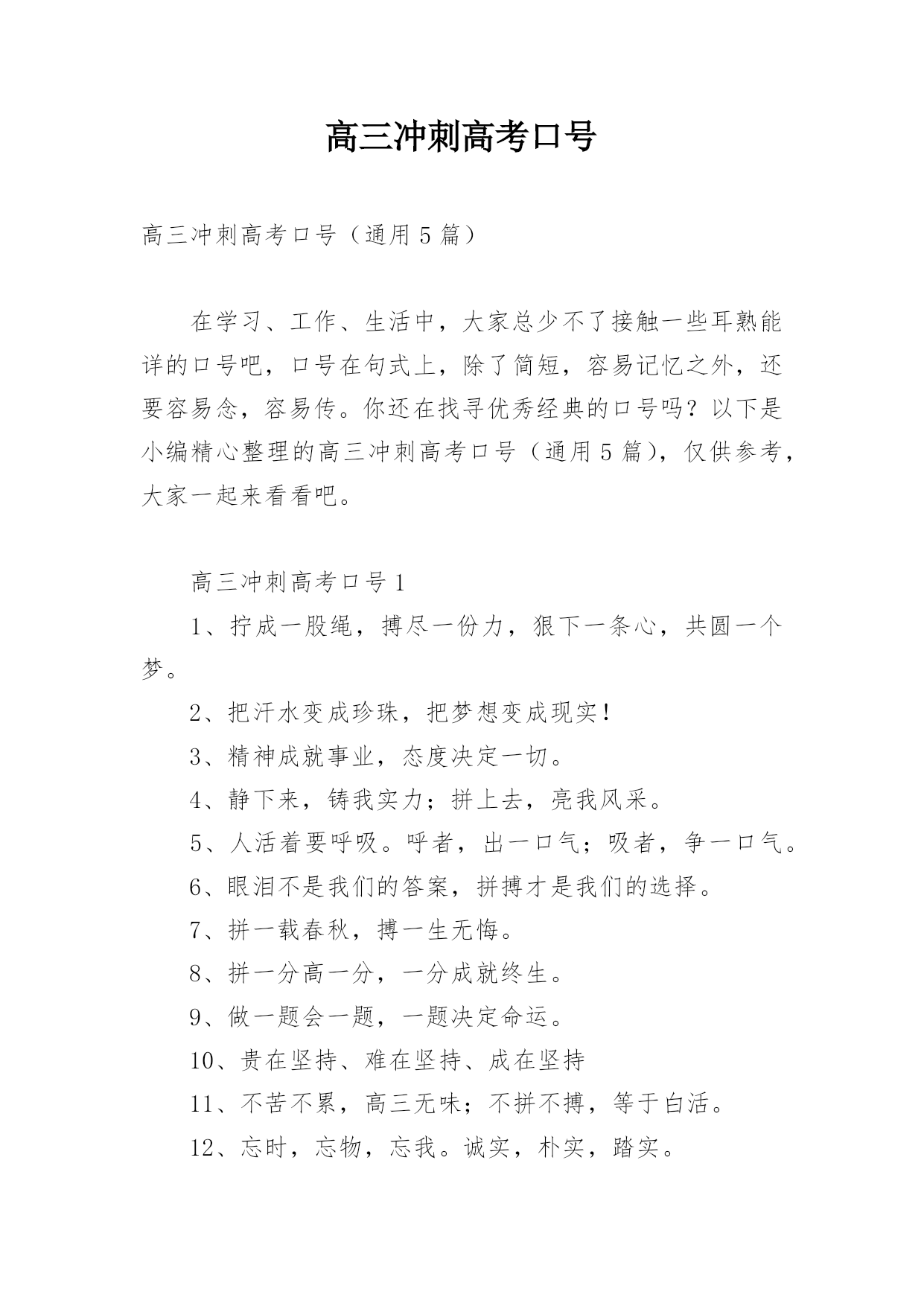 高三冲刺高考口号高三冲刺高考口号(通用5篇)在学习、工作、生活中,大家总少不了接触一些耳熟能详的口号吧,口号在句式上,除了简短,容易记忆之外,还要容易念,容易传。你还在找寻优秀经典的口号吗?以下是小编精心整理的高三冲刺高考口号(通用5篇),仅供参考,大家一起来看看吧。高三冲刺高考口号11、拧成一股绳,搏尽一份力,狠下一条心,共圆一个梦。2、把汗水变成珍珠,把梦想变成现实!3、精神成就事业,态度决定一切。4、静下来,铸我实力;拼上去,亮我风采。5、人活着要呼吸。呼者,出一口气;吸者,争一口气。6、眼泪不是我