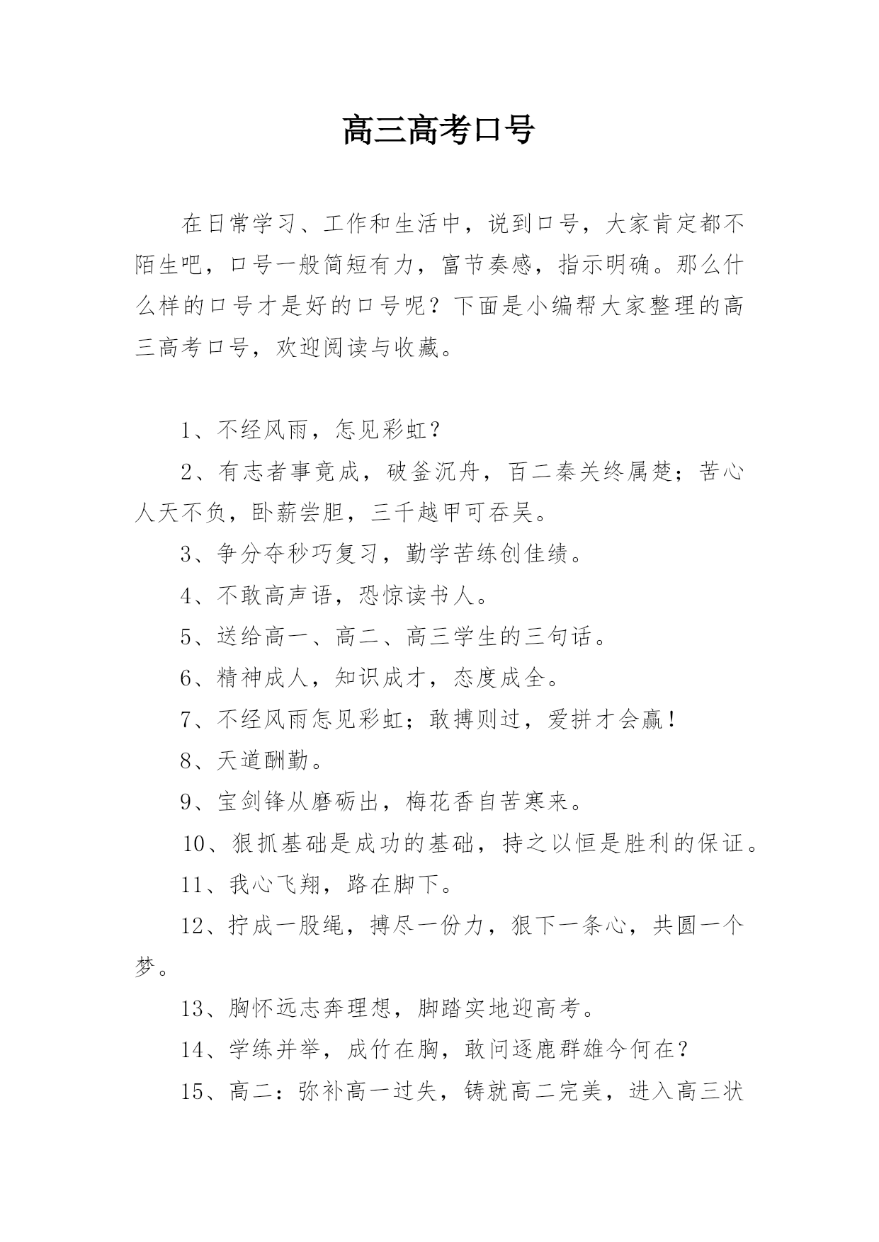 高三高考口号在日常学习、工作和生活中,说到口号,大家肯定都不陌生吧,口号一般简短有力,富节奏感,指示明确。那么什么样的口号才是好的口号呢?下面是小编帮大家整理的高三高考口号,欢迎阅读与收藏。1、不经风雨,怎见彩虹?2、有志者事竟成,破釜沉舟,百二秦关终属楚;苦心人天不负,卧薪尝胆,三千越甲可吞吴。3、争分夺秒巧复习,勤学苦练创佳绩。4、不敢高声语,恐惊读书人。5、送给高一、高二、高三学生的三句话。6、精神成人,知识成才,态度成全。7、不经风雨怎见彩虹;敢搏则过,爱拼才会赢!8、天道酬勤。9、宝剑锋从磨砺出