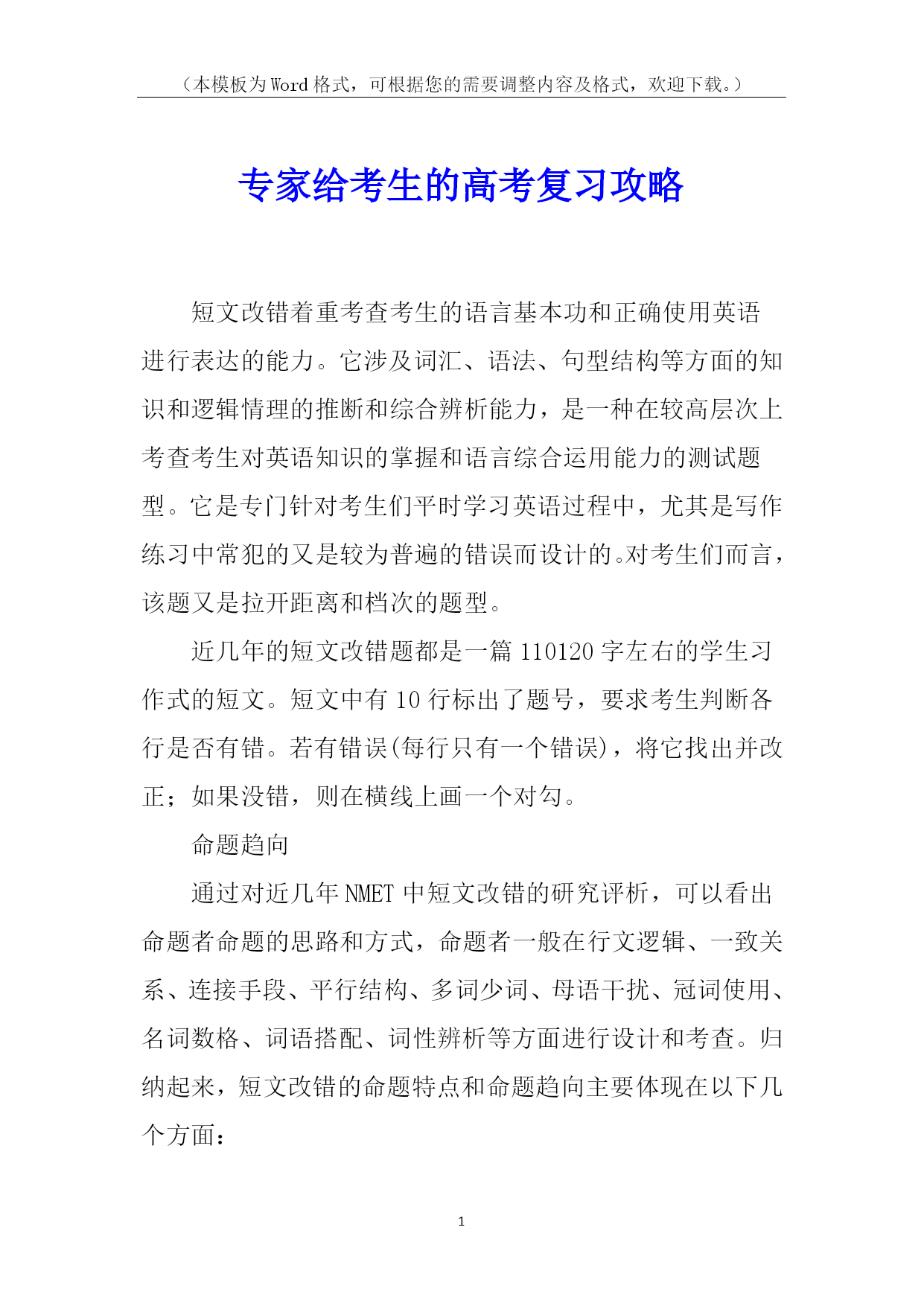 (本模板为Word格式,可根据您的需要调整内容及格式,欢迎下载。)PAGE\*MERGEFORMAT5专家给考生的高考复习攻略短文改错着重考查考生的语言基本功和正确使用英语进行表达的能力。它涉及词汇、语法、句型结构等方面的知识和逻辑情理的推断和综合辨析能力,是一种在较高层次上考查考生对英语知识的掌握和语言综合运用能力的测试题型。它是专门针对考生们平时学习英语过程中,尤其是写作练习中常犯的又是较为普遍的错误而设计的。对考生们而言,该题又是拉开距离和档次的题型。近几年的短文改错题都是一篇110120字左