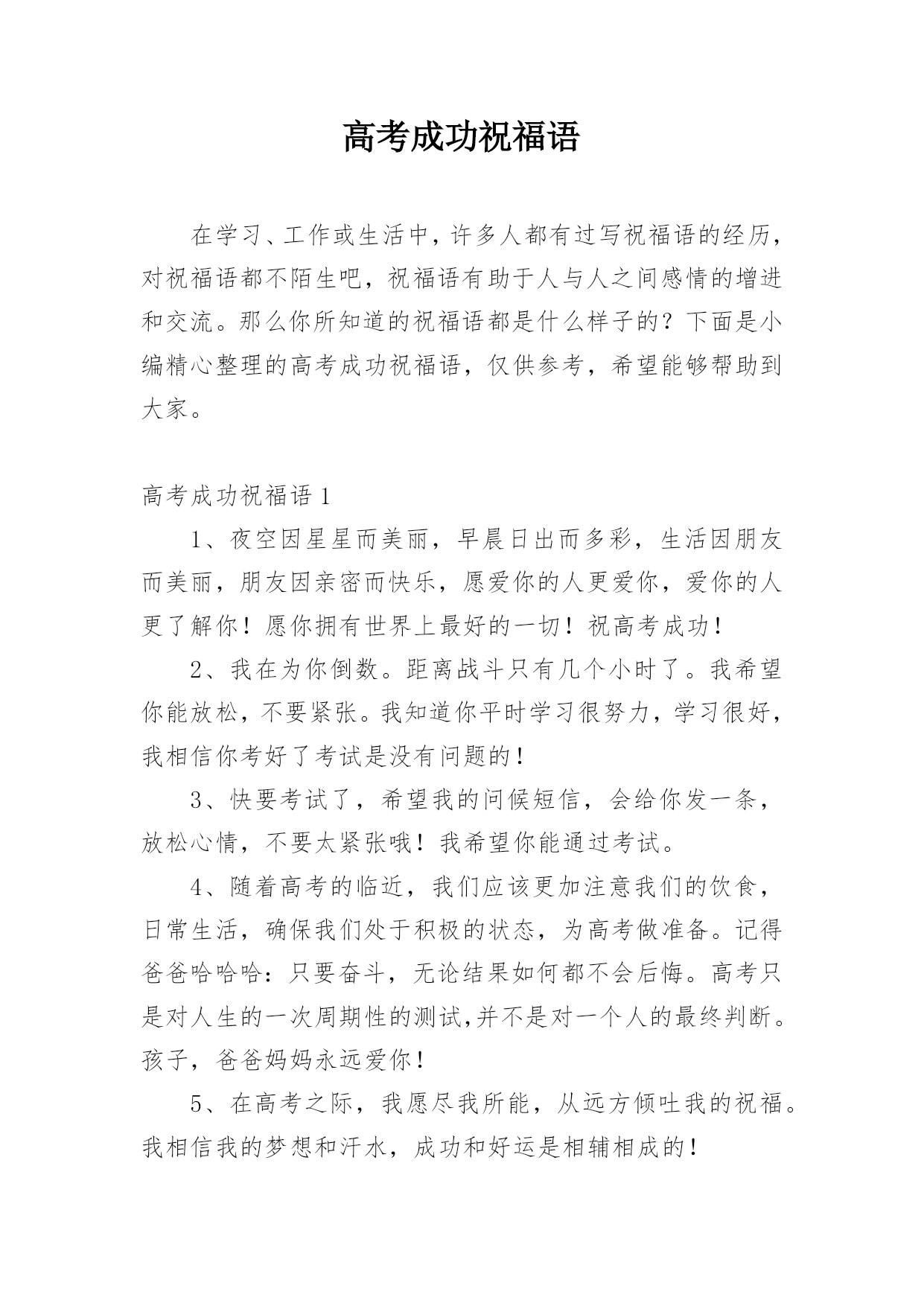 高考成功祝福语在学习、工作或生活中,许多人都有过写祝福语的经历,对祝福语都不陌生吧,祝福语有助于人与人之间感情的增进和交流。那么你所知道的祝福语都是什么样子的?下面是小编精心整理的高考成功祝福语,仅供参考,希望能够帮助到大家。高考成功祝福语11、夜空因星星而美丽,早晨日出而多彩,生活因朋友而美丽,朋友因亲密而快乐,愿爱你的人更爱你,爱你的人更了解你!愿你拥有世界上最好的一切!祝高考成功!2、我在为你倒数。距离战斗只有几个小时了。我希望你能放松,不要紧张。我知道你平时学习很努力,学习很好,我相信你考好了考试