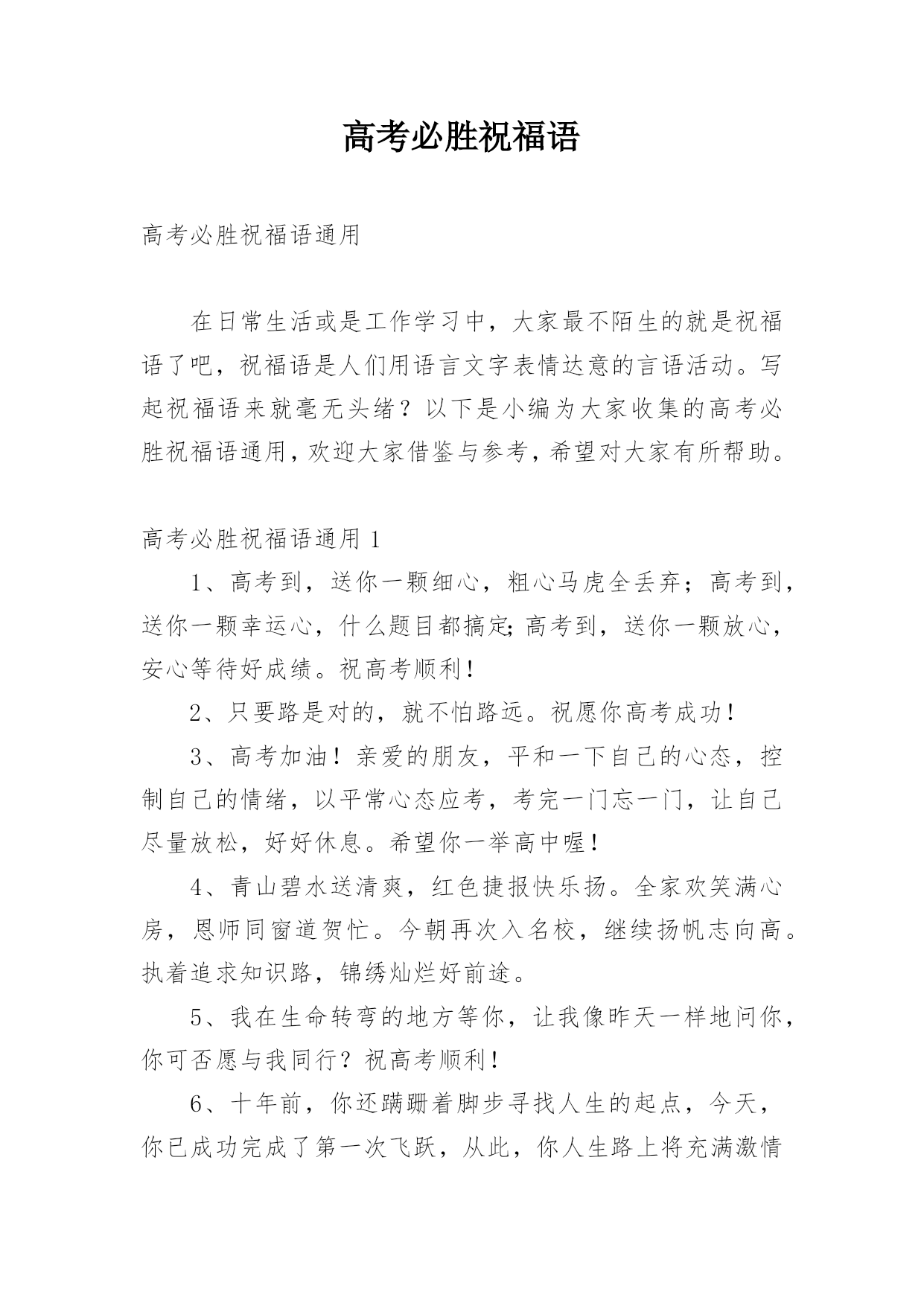 高考必胜祝福语高考必胜祝福语通用在日常生活或是工作学习中,大家最不陌生的就是祝福语了吧,祝福语是人们用语言文字表情达意的言语活动。写起祝福语来就毫无头绪?以下是小编为大家收集的高考必胜祝福语通用,欢迎大家借鉴与参考,希望对大家有所帮助。高考必胜祝福语通用11、高考到,送你一颗细心,粗心马虎全丢弃;高考到,送你一颗幸运心,什么题目都搞定;高考到,送你一颗放心,安心等待好成绩。祝高考顺利!2、只要路是对的,就不怕路远。祝愿你高考成功!3、高考加油!亲爱的朋友,平和一下自己的心态,控制自己的情绪,以平常心态应考